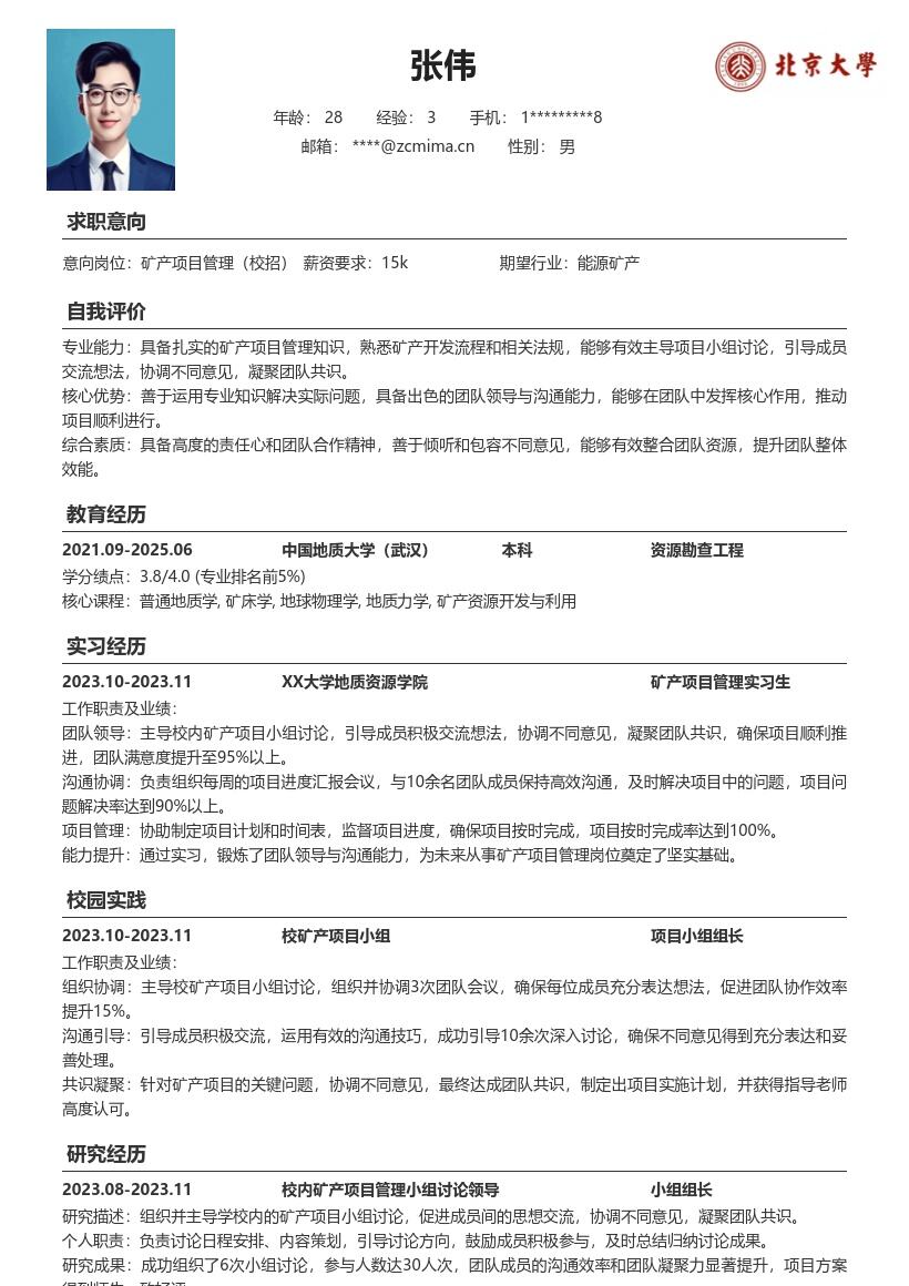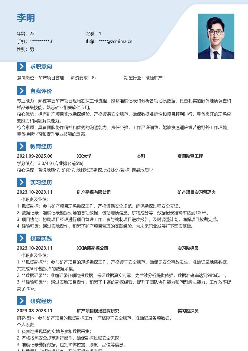 2. **教育背景**:按照从最高学历开始的顺序填写。学校名称要写全称,专业名称准确无误。列出入学时间和毕业时间,同时可以添加在校期间取得的相关课程成绩排名、GPA(如果成绩优秀的话)等信息,突出自己在学业上的表现。对于矿产相关专业课程,可以重点标注,比如“矿床学”“矿山地质学”“矿产资源勘查学”等,让招聘方看到你专业知识的储备。