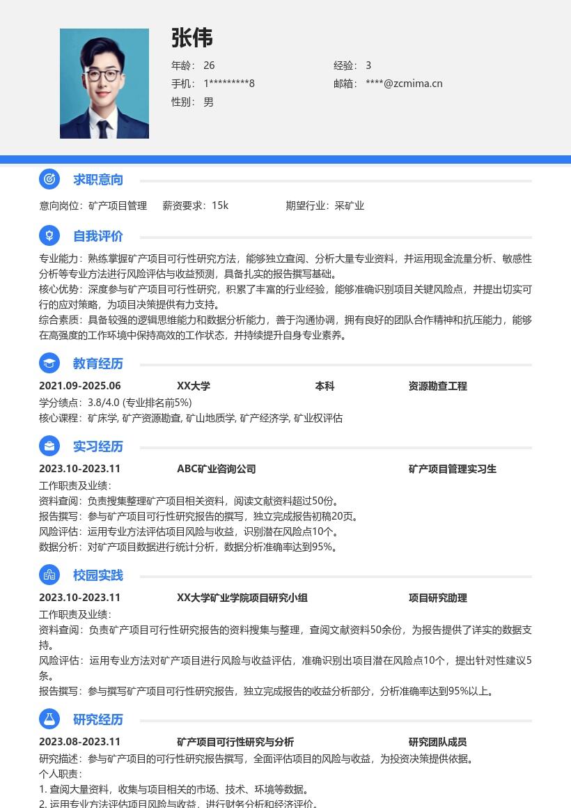 职场密码版权所有,购买后仅限自己使用,严禁转载、转售!: 职场密码-在线简历制作简历模板职场课程简历优化 » 20多套矿产项目管理(校招)岗位简历模板合集word版