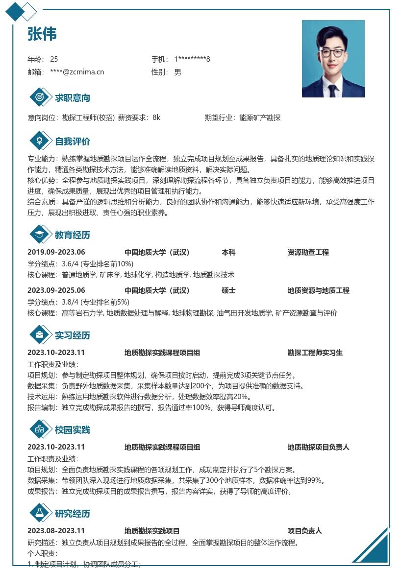 职场密码版权所有,购买后仅限自己使用,严禁转载、转售!: 职场密码-在线简历制作简历模板职场课程简历优化 » 20多套勘探工程师(校招)岗位简历模板合集word版