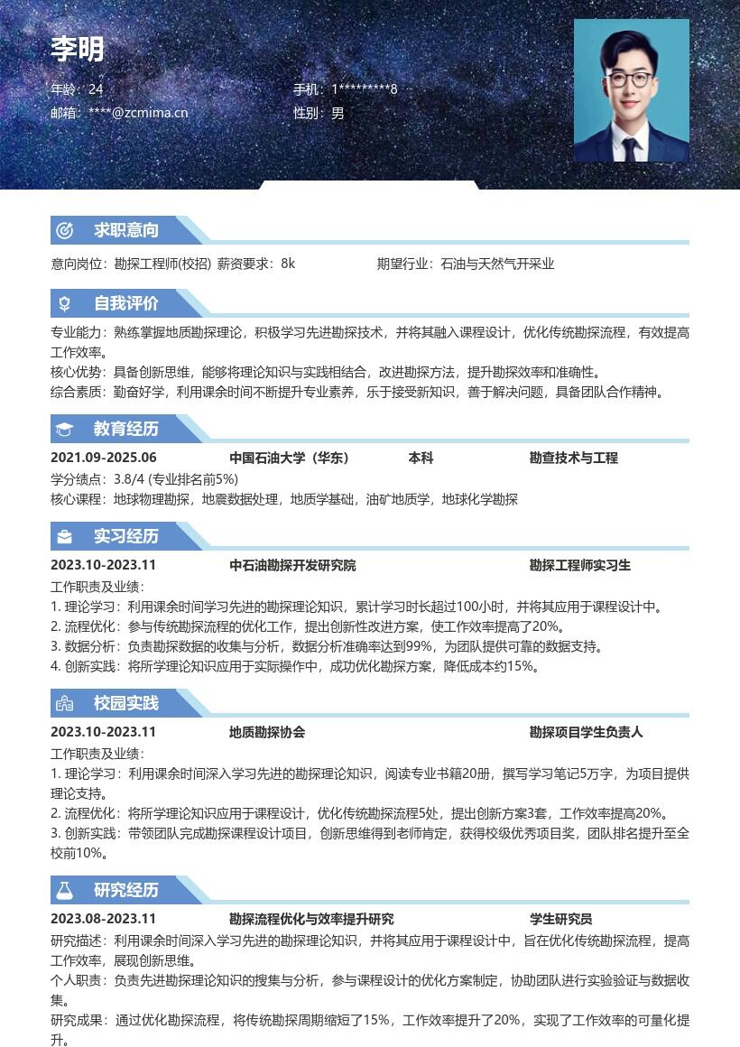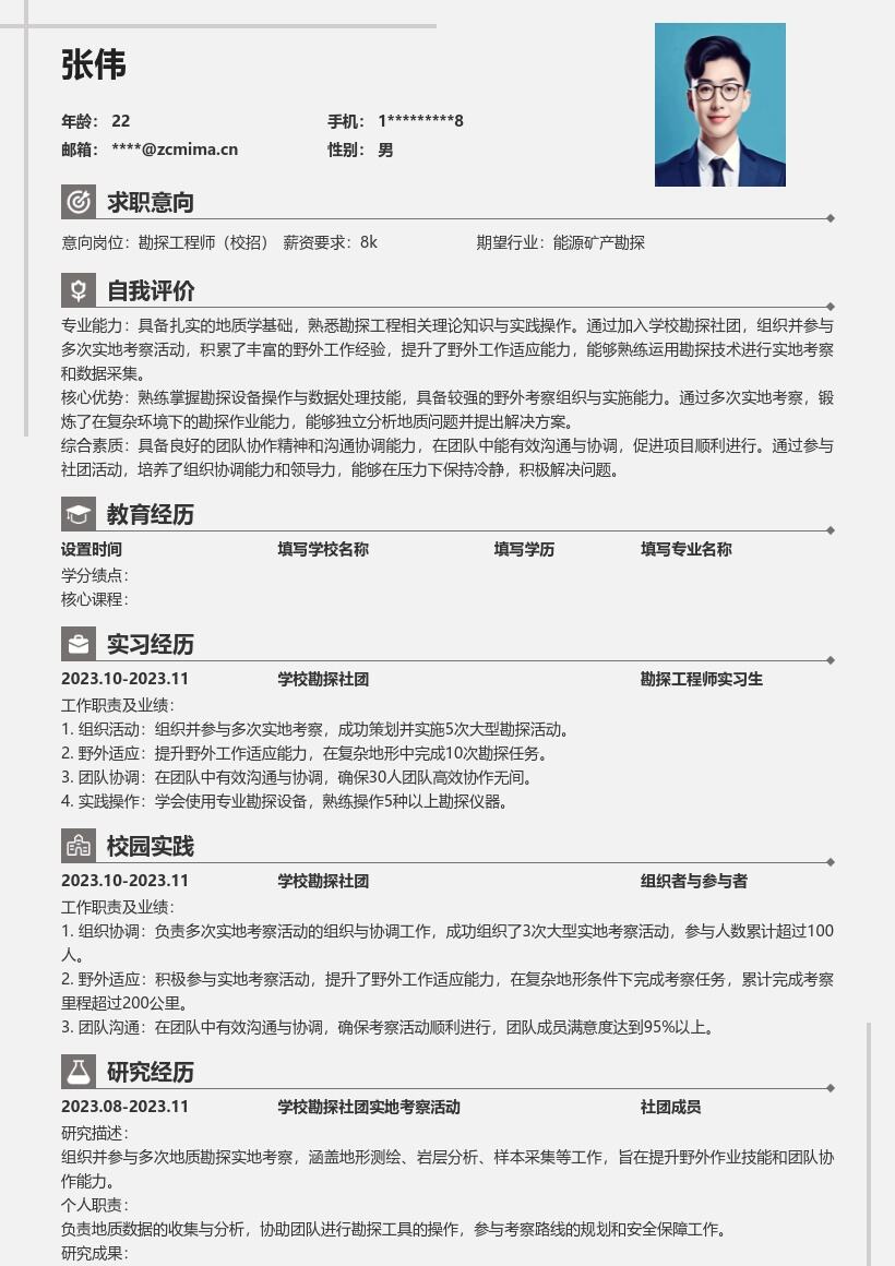2. **教育背景部分**:重点突出本科院校及专业名称,按照时间顺序填写入学和毕业时间。对于与勘探工程师相关的专业课程,如地质学基础、地球物理勘探、岩土工程勘察等,可以适当罗列,以体现你具备该岗位所需的理论知识基础。如果你的成绩较为优异,有相关的绩点、排名信息,也可一同列出,增强竞争力。