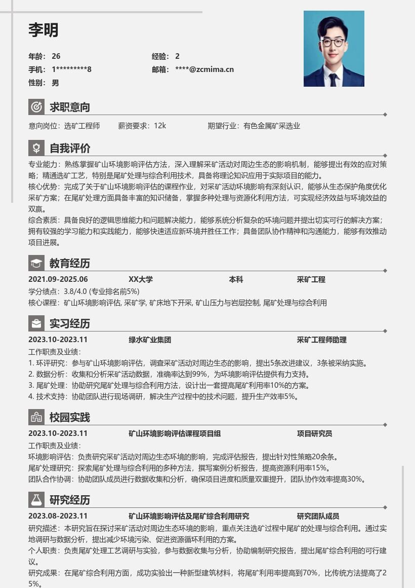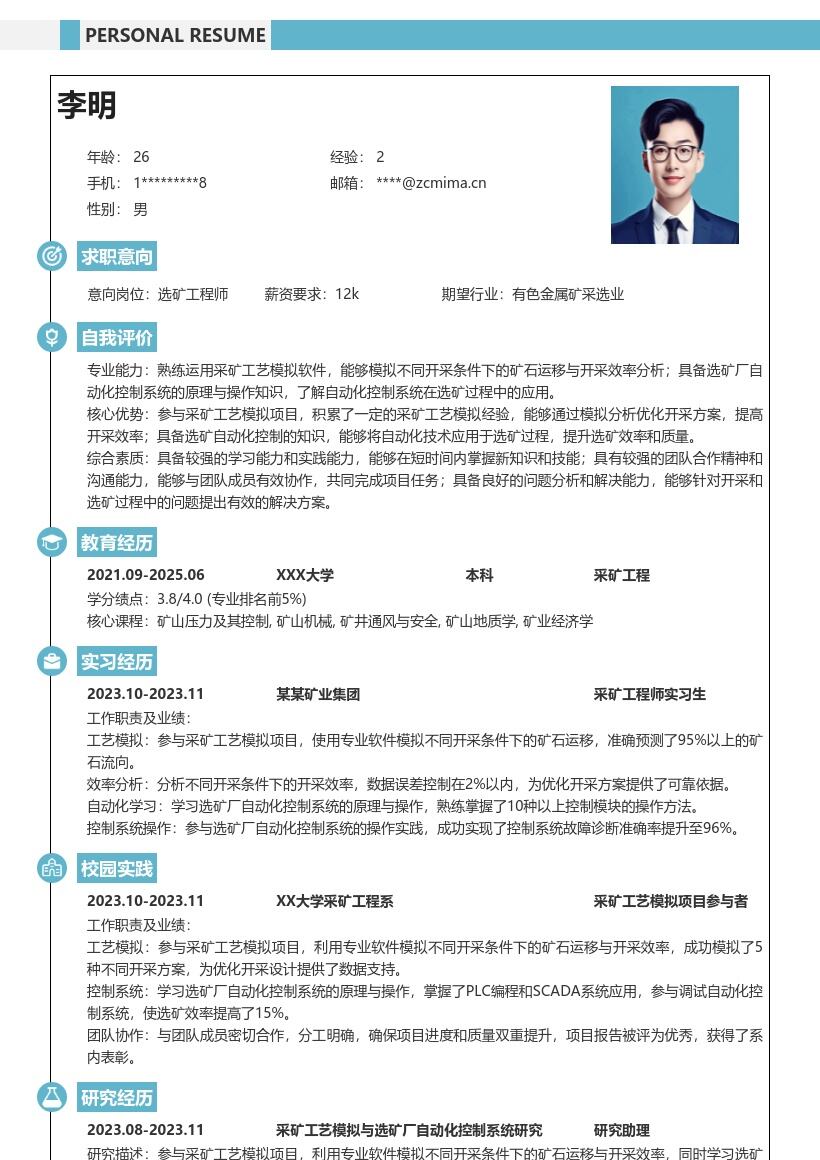 1. **个人信息**:首先,在简历开头清晰列出个人基本信息,包括姓名、性别、出生日期、联系方式(手机号码与电子邮箱)、求职意向(明确选矿/采矿岗位)、毕业院校及专业等。确保信息准确无误,方便招聘方快速了解你的基本情况。