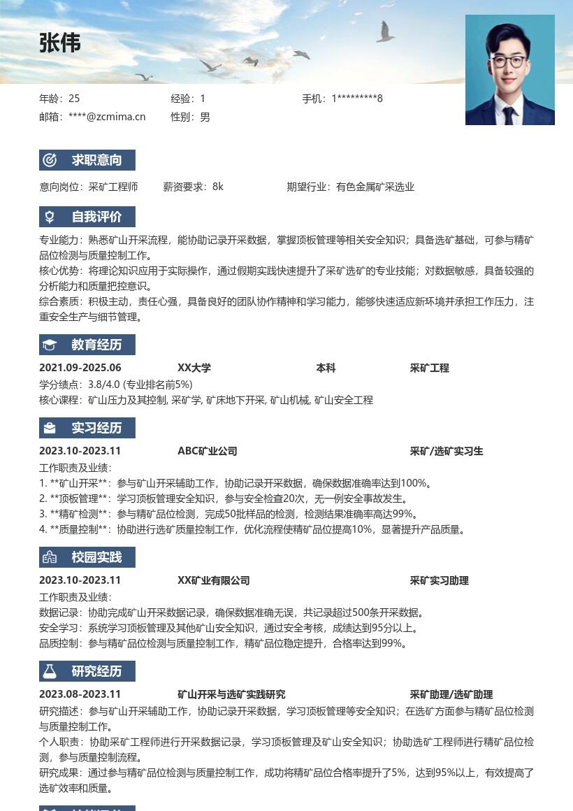 2. **教育背景**:详细填写大学期间的教育经历,从最高学历开始写起。列出学校名称、专业名称、入学时间与毕业时间。对于采矿工程相关专业,可强调所学的核心课程,如采矿学、矿山压力与岩层控制、选矿学等,突出自己的专业知识储备。
