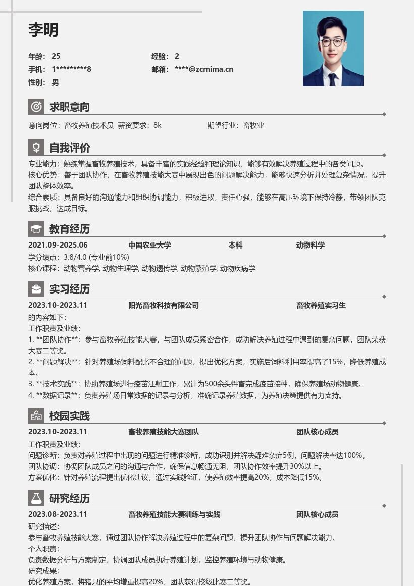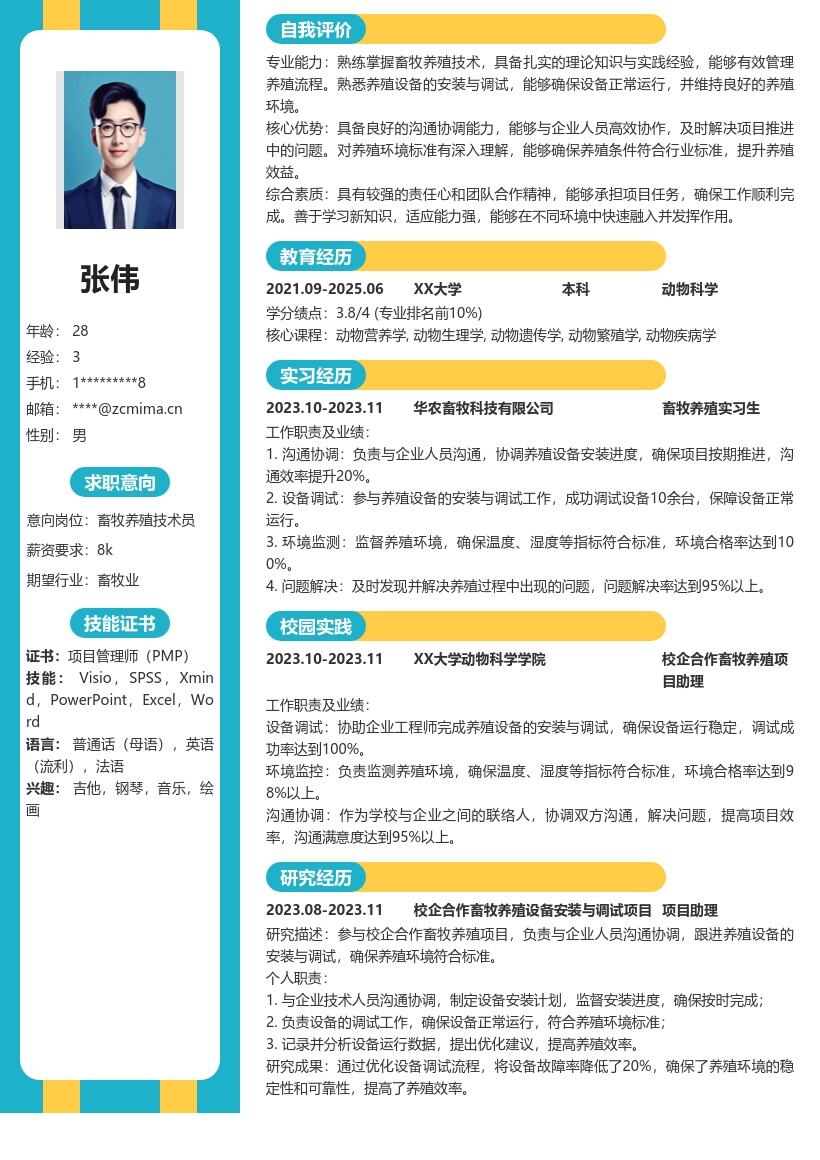 职场密码版权所有,购买后仅限自己使用,严禁转载、转售!: 职场密码-在线简历制作简历模板职场课程简历优化 » 20多套畜牧养殖(校招)岗位简历模板合集word版
