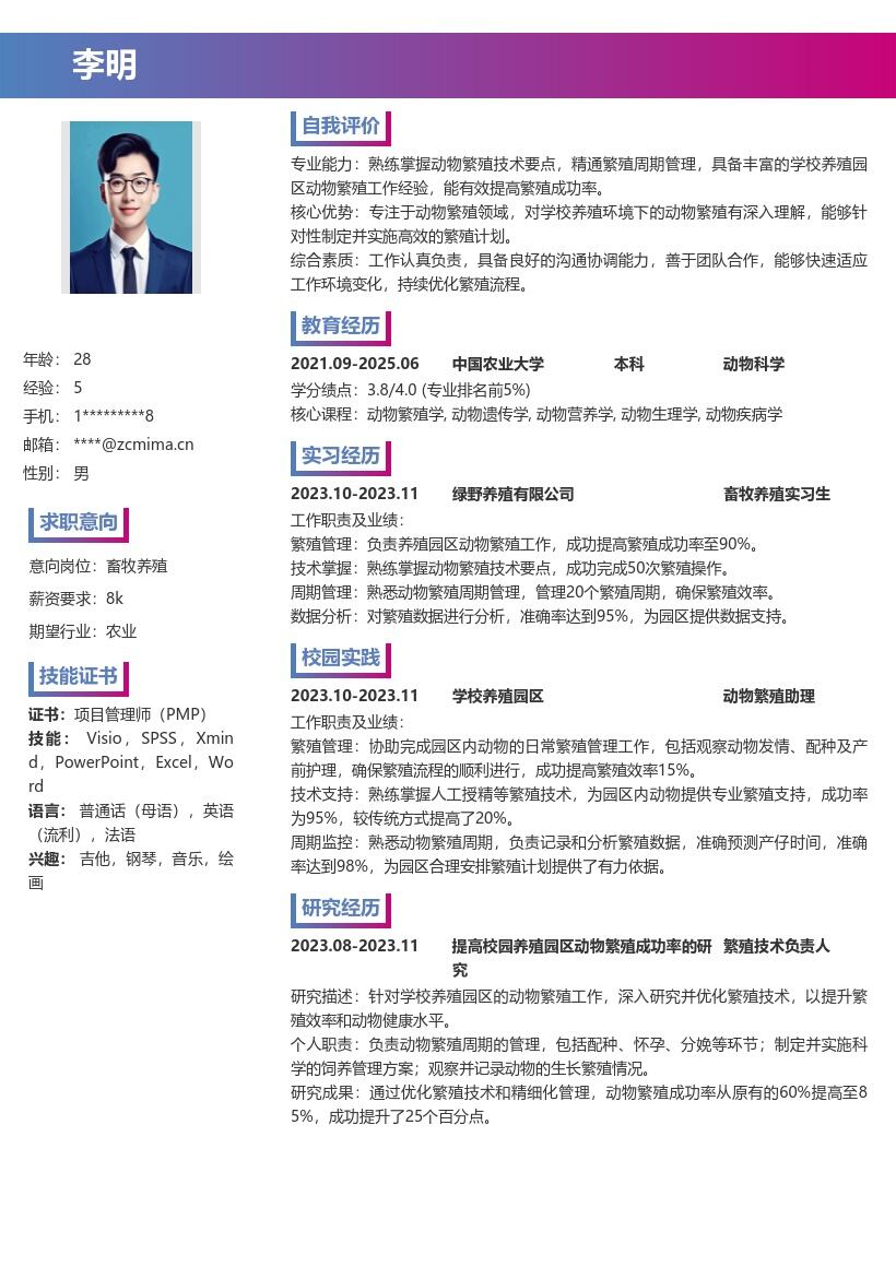 重点突出自己在校期间与畜牧养殖相关的学习经历。详细列出所学的专业课程,比如动物生理学、动物营养学、畜牧微生物学等,这些课程展示了你在畜牧养殖理论知识方面的储备。提及在校期间取得的优异成绩或获得的相关奖学金,以证明自己的学习能力。如果有参与和畜牧养殖相关的学术研究或课程项目,也要详细描述,包括项目的主题、自己在项目中的角色和贡献,以及通过项目所获得的成果和收获。