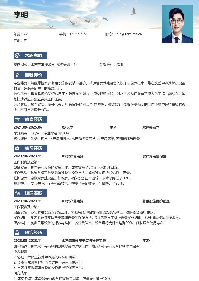 1. **个人信息部分**:首先,在简历开头清晰列出你的姓名、性别、联系方式(手机号码、电子邮箱)以及求职意向——水产养殖岗位。确保这些信息准确无误,方便招聘者能顺利与你取得联系。例如,你的姓名要使用真实全名,手机号码保持畅通,电子邮箱定期查看,避免错过重要通知。