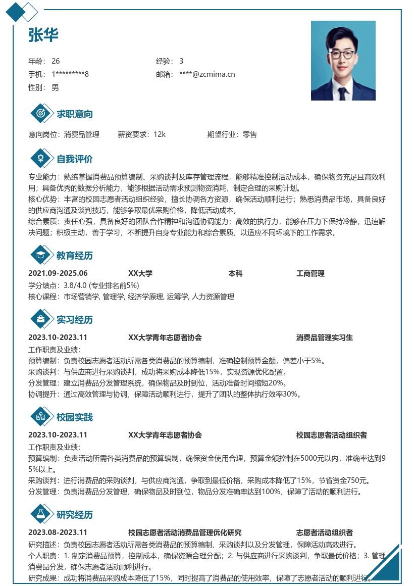 6. **其他补充**:如果有相关的实习经历、社团活动经历或获得的荣誉奖项,也可在简历中适当展示,进一步丰富个人经历,全面展示自己的综合素质。总之,一份优秀的消费品管理校招简历要突出重点、逻辑清晰、数据支撑有力,充分展示你的专业能力和潜力。