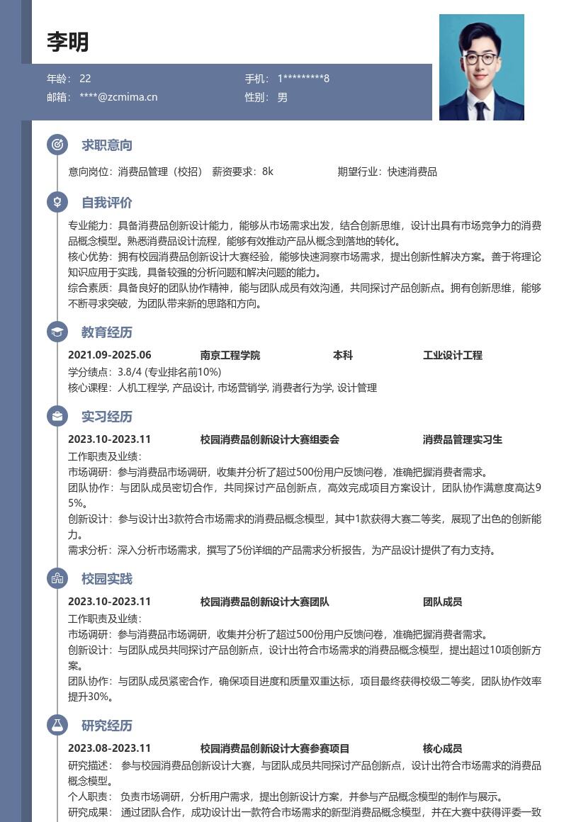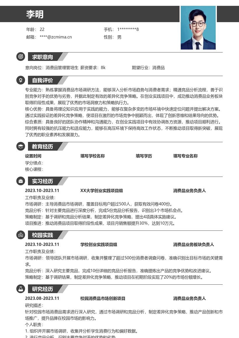 5. **自我评价部分**:用简洁明了的语言概括自己的优势。强调对消费品行业的热情,具备较强的市场分析能力、团队协作能力和执行力。提及在校园项目中所培养的解决问题的能力和应变能力,表达自己对未来从事消费品管理工作的信心和决心。