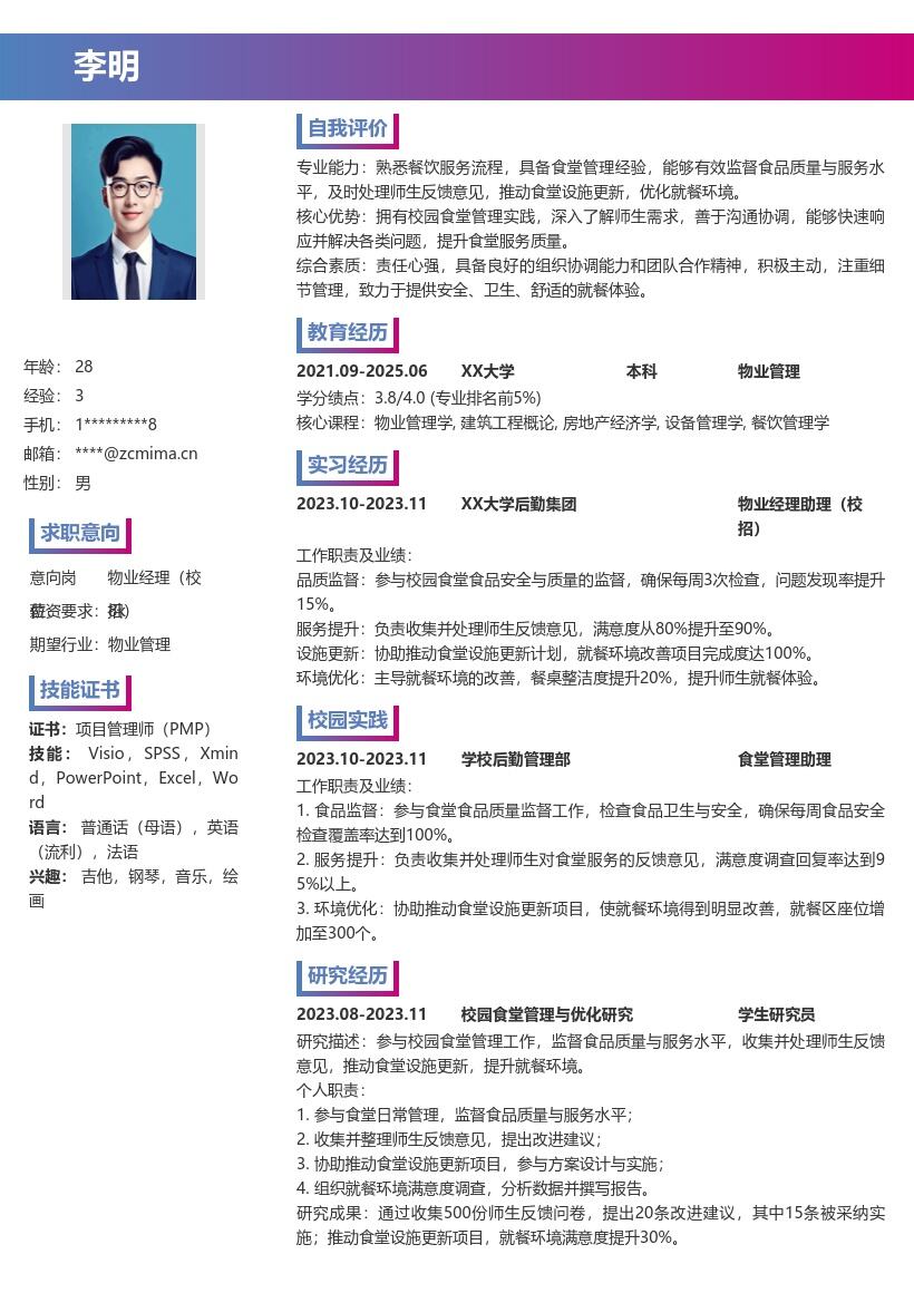 - 在自我评价部分,简要概括自己的优势。强调自己具备较强的组织协调能力,从校园活动总协调和设施管理项目中积累了丰富的沟通和资源整合经验。