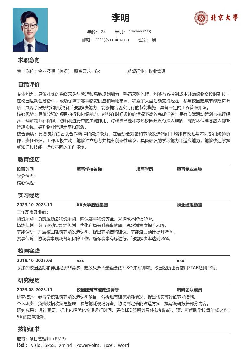- 详细列出自己的教育背景。从最高学历开始写起,包括学校名称、专业名称、入学时间和毕业时间。对于物业相关专业的同学,可突出所学的与物业知识紧密相关的课程,如物业管理概论、物业设施设备管理、房地产经营管理等。如果在校期间有获得相关的学术成果,如发表论文、参与科研项目等,也可在此部分适当展示,以体现自己的学习能力和专业深度。