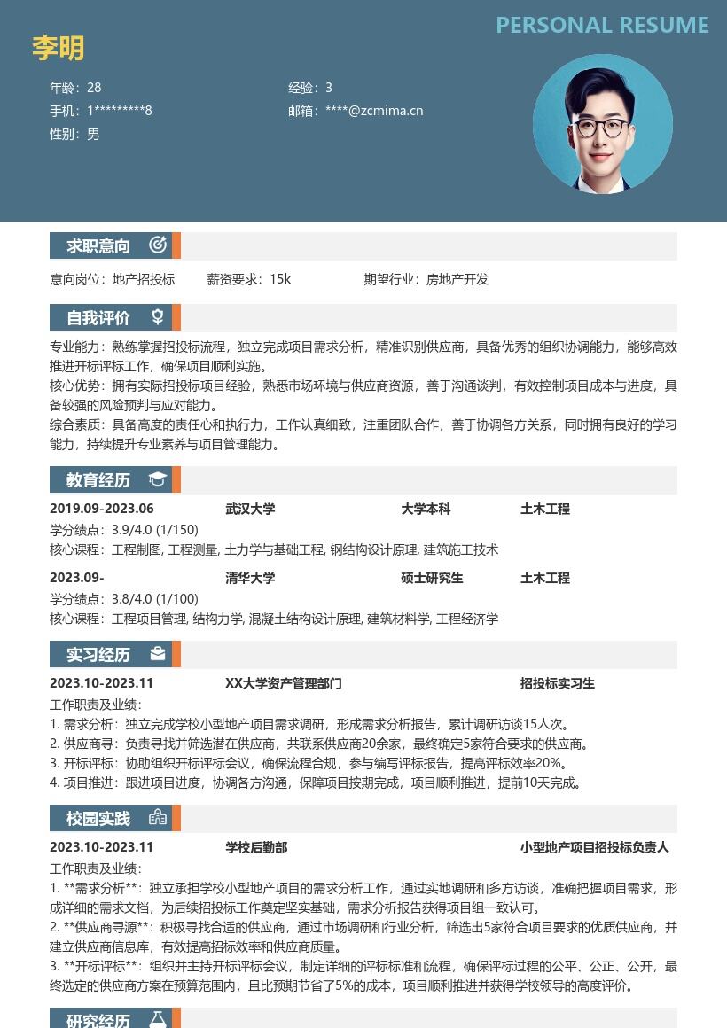 首先在简历开头清晰填写个人基本信息,包括姓名、性别、年龄、联系方式(手机号码与电子邮箱)。确保联系方式准确无误,方便招聘者能及时与你取得联系。同时,添加个人求职意向,明确写出应聘地产招投标岗位,让招聘者一眼了解你的求职方向。