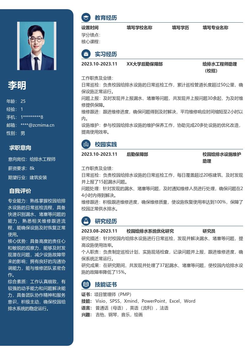 - 提及在校参与的给排水相关课程项目,像住宅小区给排水系统规划与设计项目。阐述项目背景,说明该项目是为了满足小区居民日常生活用水及排水需求而开展。