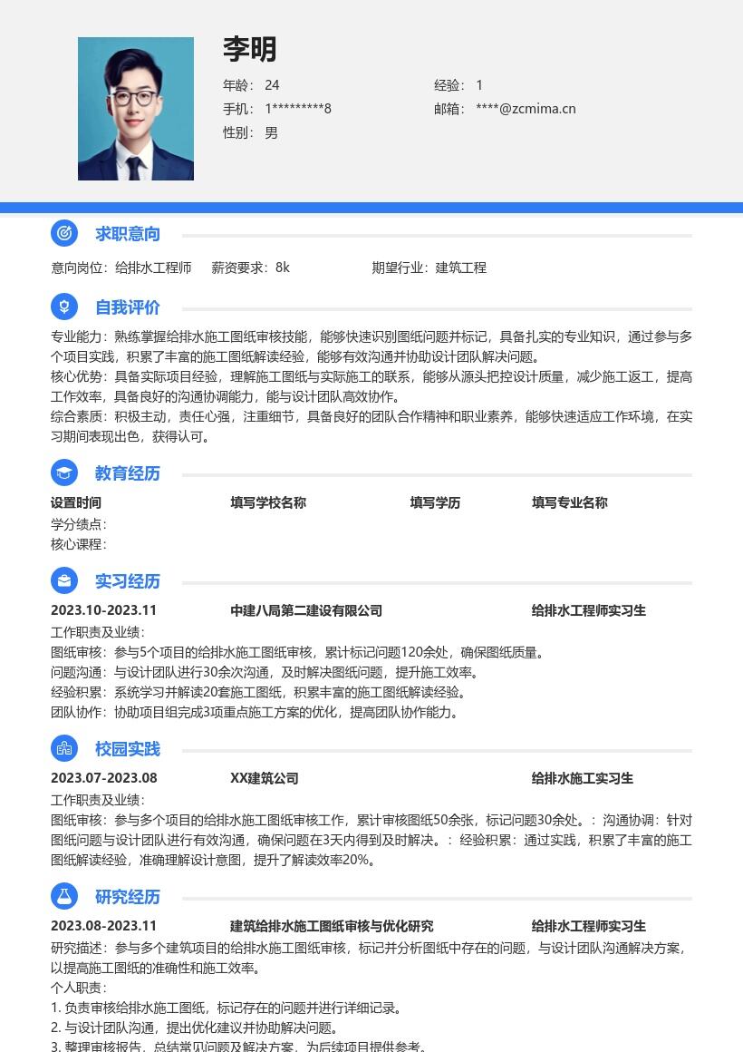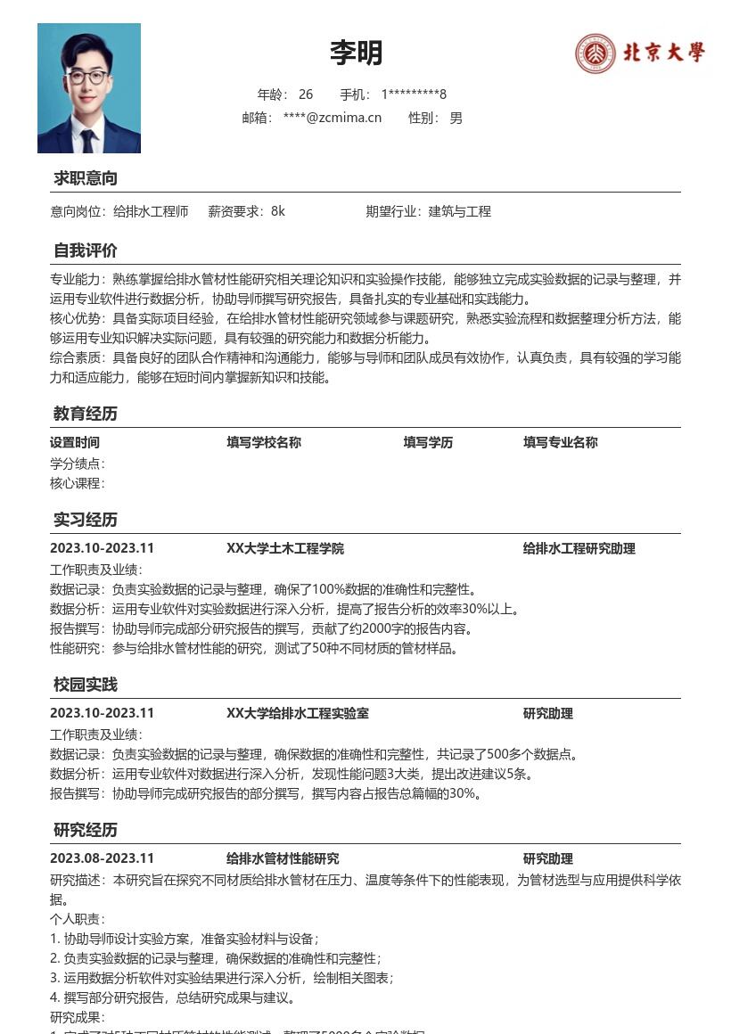- 填写好毕业院校、专业名称以及预计毕业时间。对于给排水工程师校招岗位,学校和专业信息是很重要的基础内容,能让招聘者快速了解你的教育背景是否匹配。