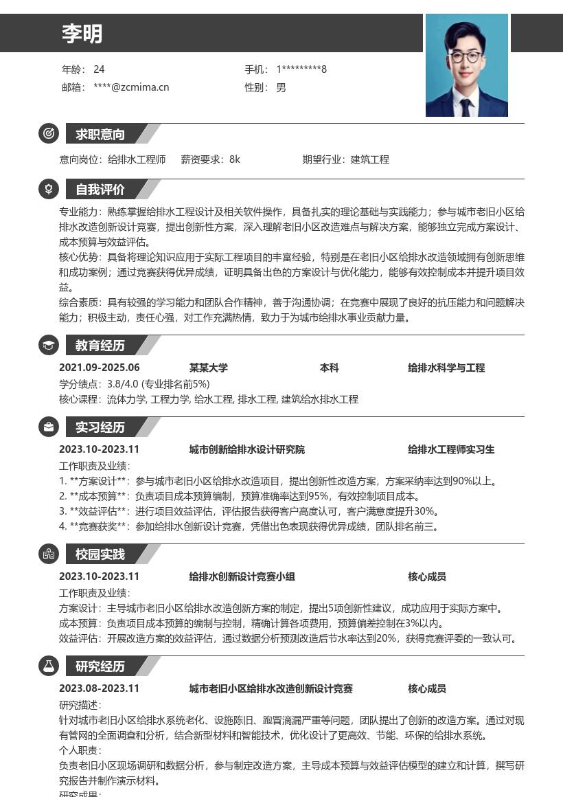 - 在自我评价中,强调自己对给排水工程的热情和学习能力。表明通过在校项目实践,具备了扎实的专业知识和解决实际问题的能力。