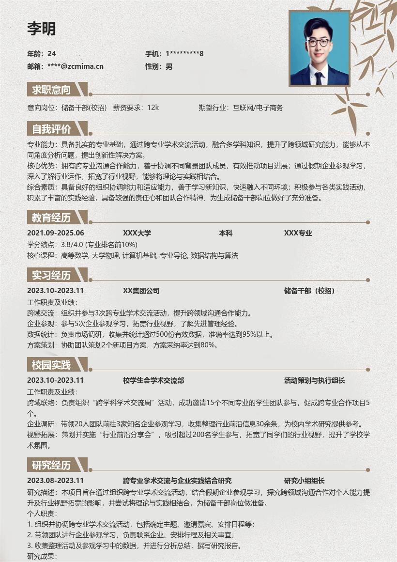 2. **教育背景**:按时间倒序排列,依次列出大学期间的院校名称、专业名称、入学时间与毕业时间。如果你的专业课程与储备干部岗位相关度较高,可适当列举一些核心课程,比如管理学原理、市场营销等,展示你在专业领域的知识储备。对于成绩优异的同学,还可以注明在校期间的平均绩点或获得的相关奖学金情况,以突出学习能力。