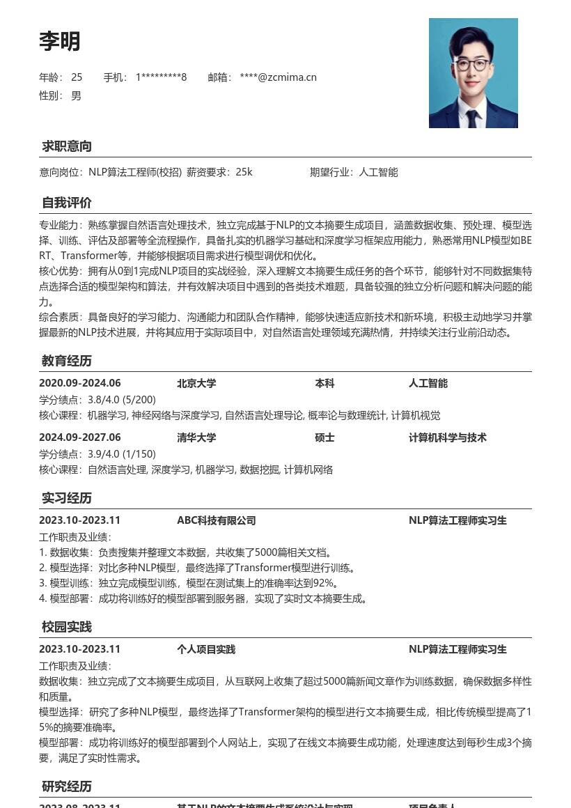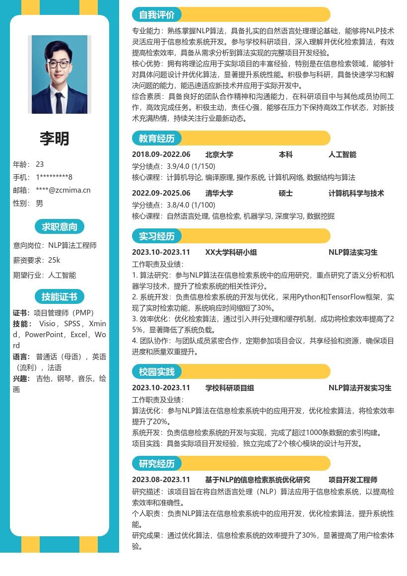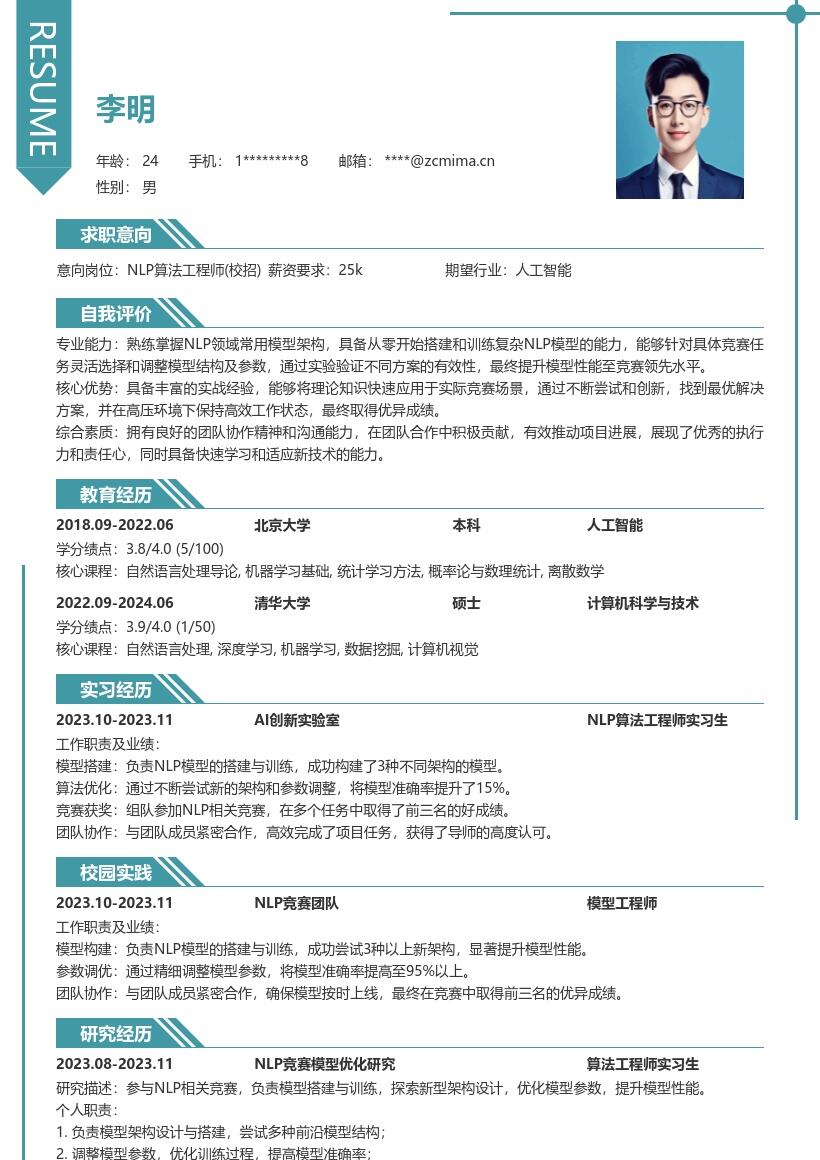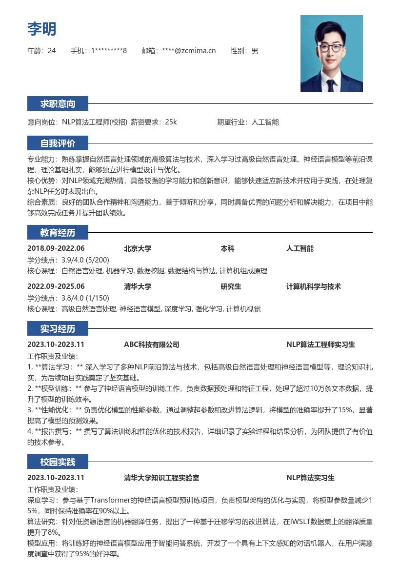 职场密码版权所有,购买后仅限自己使用,严禁转载、转售!: 职场密码-在线简历制作简历模板职场课程简历优化 » 20多套NLP 算法工程师(校招)岗位简历模板合集word版