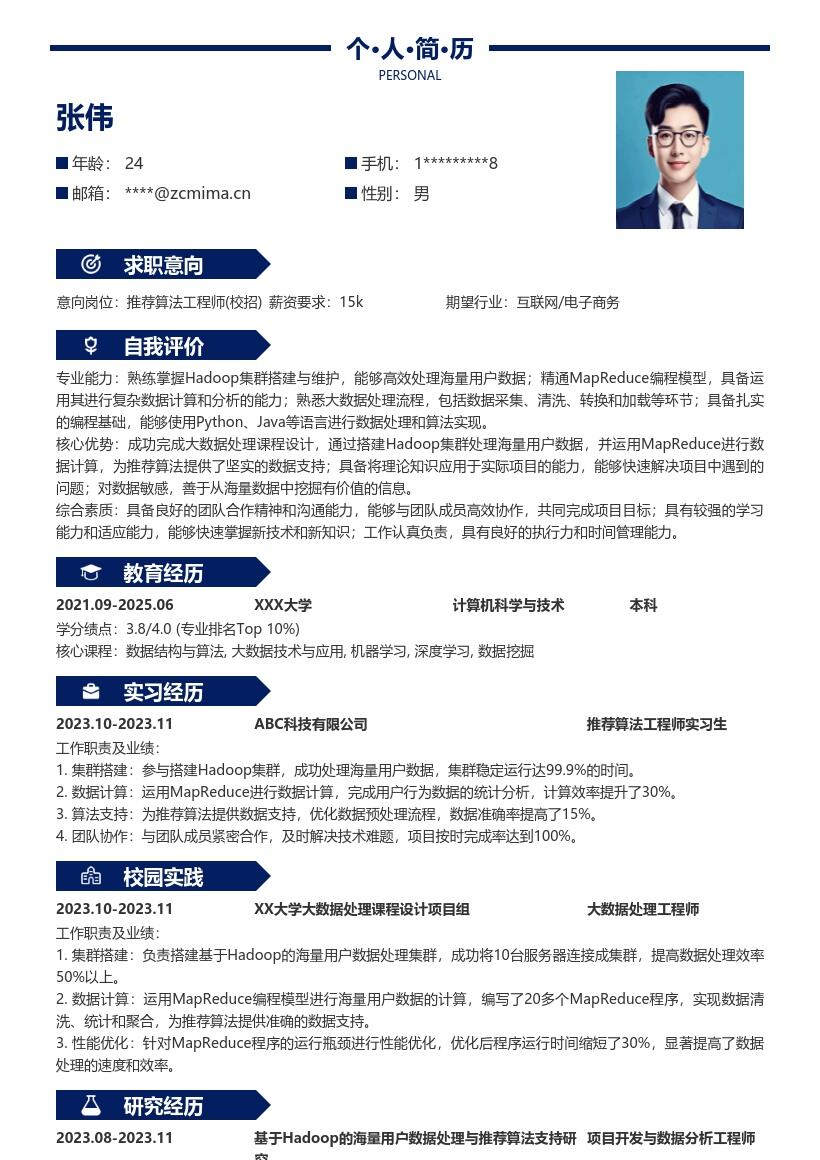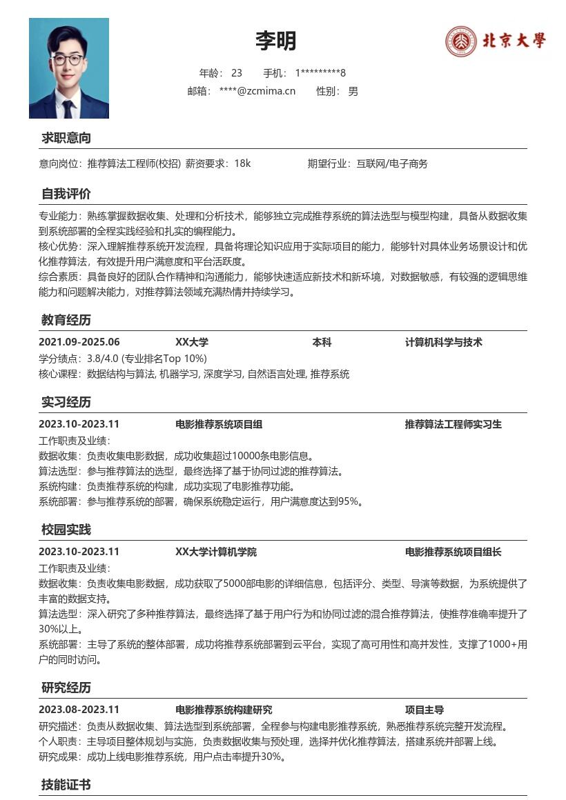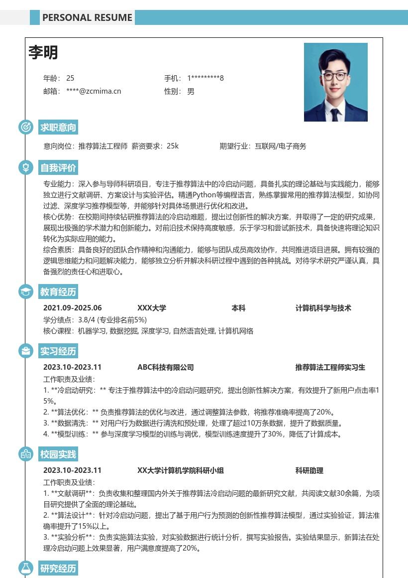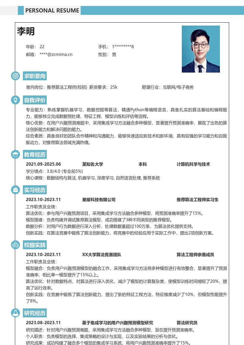 - 首先,在简历开头要清晰准确地填写个人基本信息。姓名务必用真实姓名,联系方式要留下常用且有效的手机号码和电子邮箱地址,确保招聘方能够顺利联系到你。电子邮箱建议使用专业的邮箱,避免一些过于随意的邮箱名称。同时,填写自己的性别、出生年月、民族等信息,若有政治面貌也可注明,比如中共党员、共青团员等。此外,要标注自己的求职意向为推荐算法工程师(校招),明确求职方向,让招聘方一目了然。