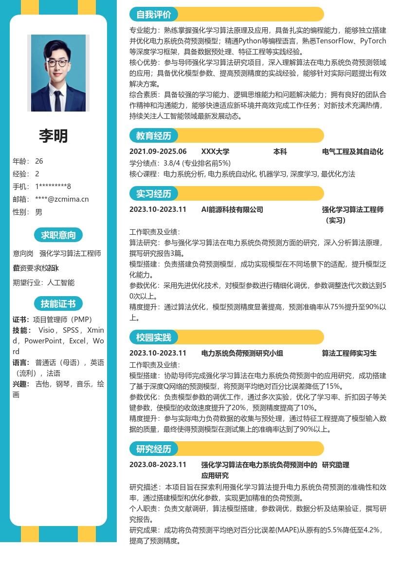 2. **教育背景**:按时间倒序列出就读学校、专业名称、入学时间与毕业时间。重点突出与强化学习相关的课程,如机器学习、人工智能、算法设计等,标注出取得的优异成绩,以体现专业知识储备。若有相关课程项目,可简要描述项目内容与自己在其中的角色和贡献。
