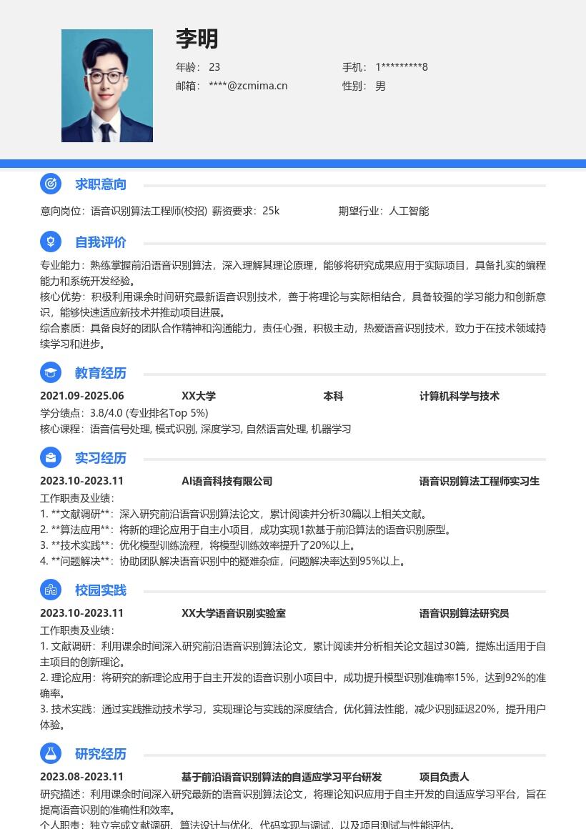 - 如果在校期间获得过与语音识别、算法相关的竞赛奖项,或者其他学科竞赛奖项,都应在此处清晰列出。包括奖项名称、颁发机构和获奖时间,奖项能充分证明个人的能力和竞争力,让招聘者对求职者的实力有更直观的认识。