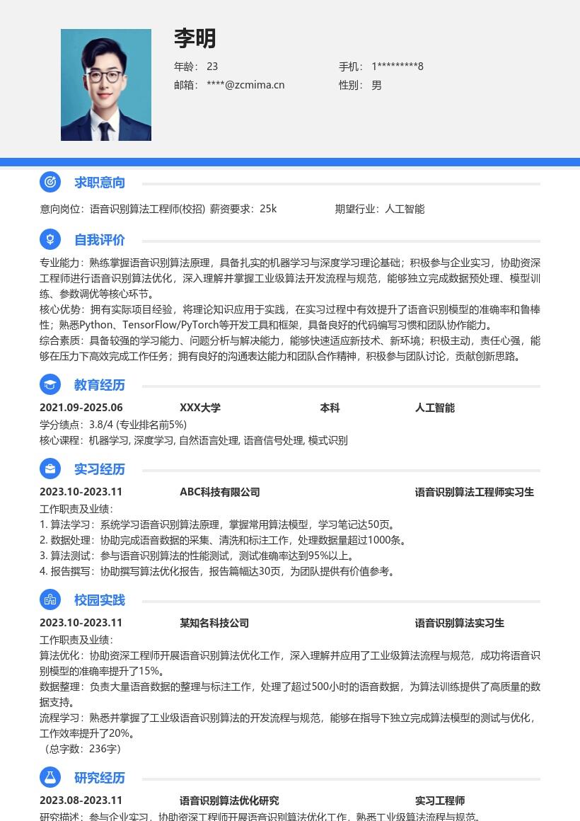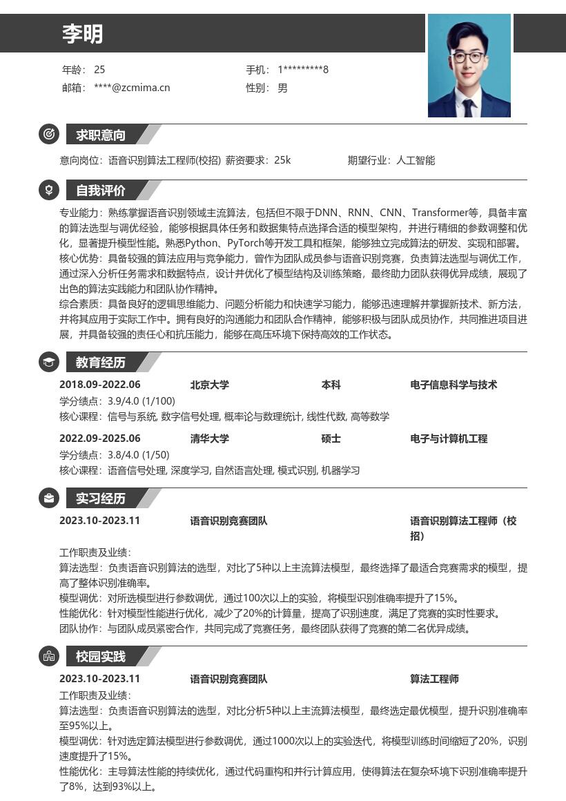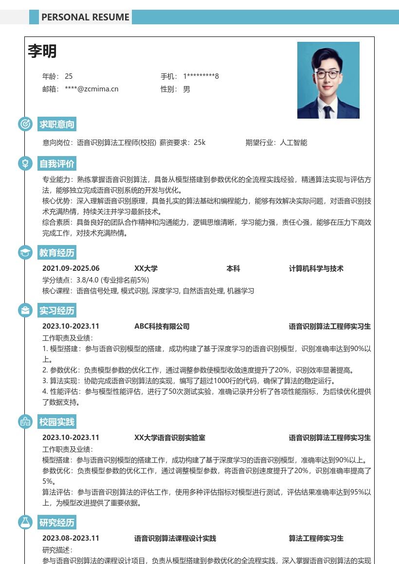 职场密码版权所有,购买后仅限自己使用,严禁转载、转售!: 职场密码-在线简历制作简历模板职场课程简历优化 » 20多套语音识别算法工程师(校招)岗位简历模板合集word版