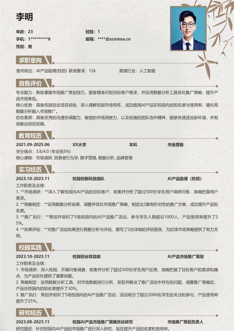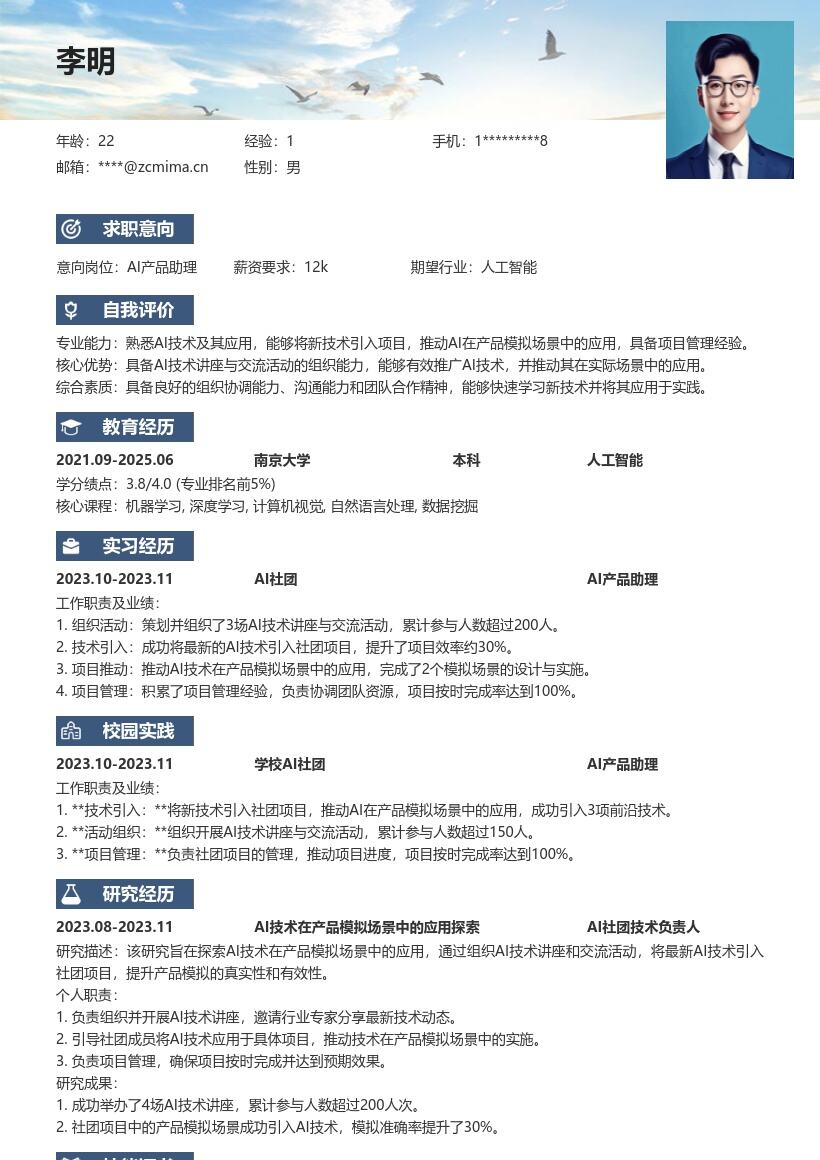 - 此外,在简历中要注明求职意向为AI产品助理(校招),明确让招聘者知道你所申请的岗位,使招聘者在第一时间对求职者的求职方向有清晰认知。