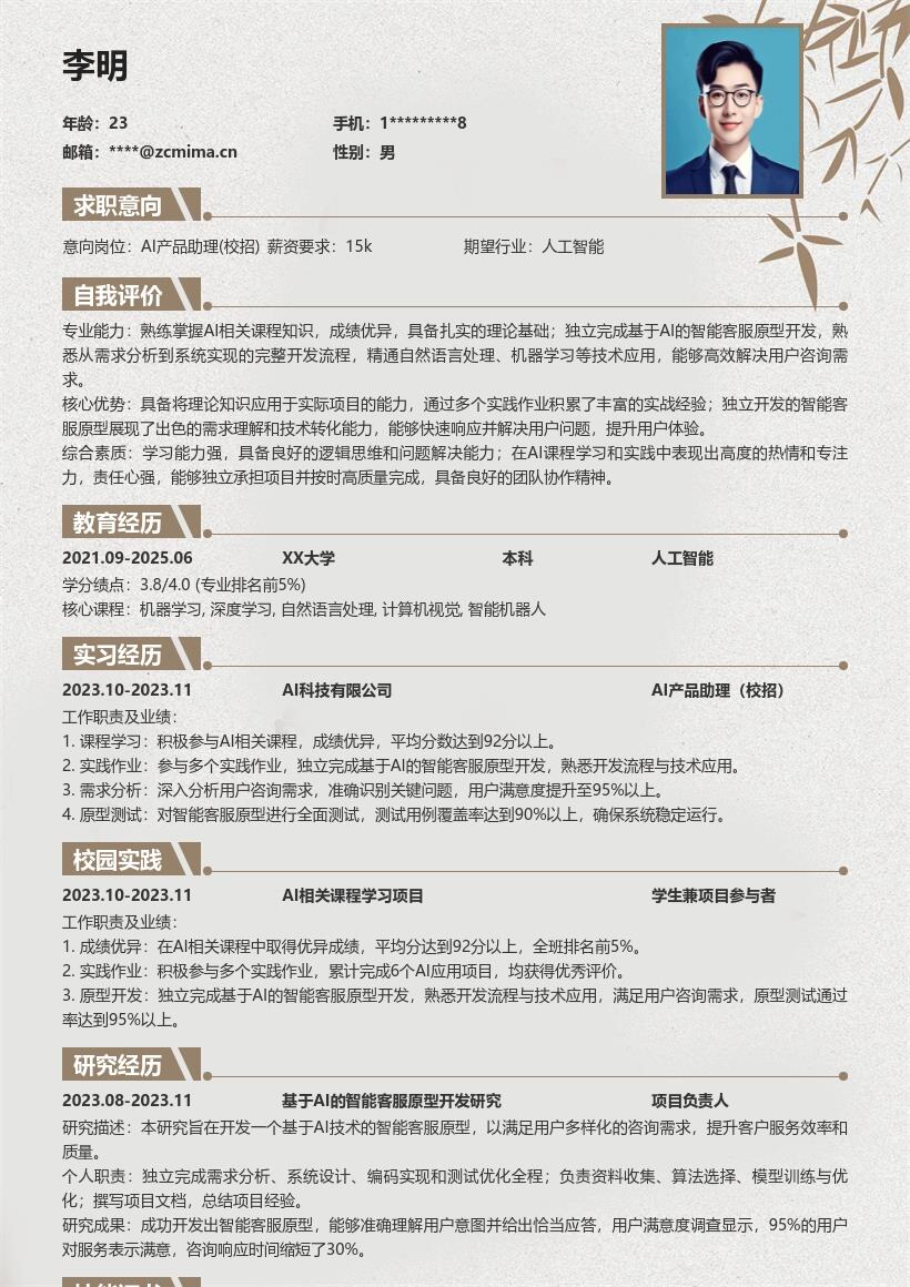 - 也可添加自我评价部分,简要概括自己的优势,如学习能力强、对AI领域有浓厚兴趣、具备良好的团队协作精神等,让招聘者快速了解你的个人特质。
