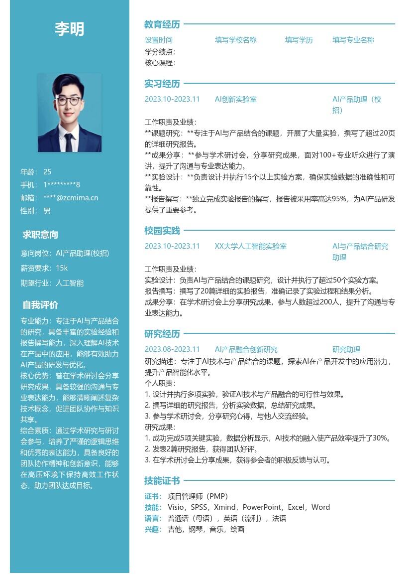 - 重点描述与AI产品相关的项目经历。以在项目中负责AI数据的收集与整理为例,要详细说明数据收集的来源渠道,是通过网络爬虫、自有数据库,还是与第三方合作获取等。