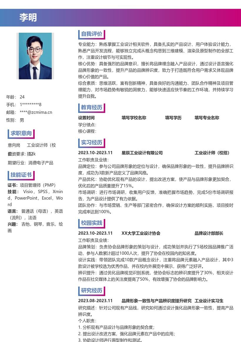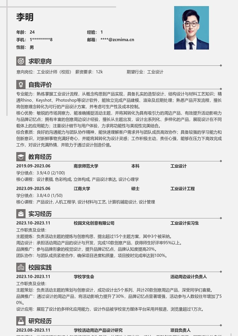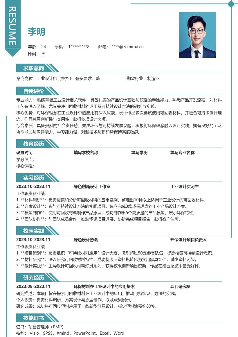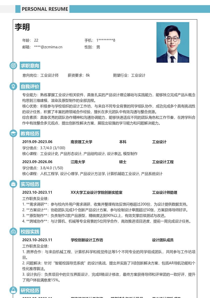 8. **其他信息**:如有参与社团活动、志愿者经历等,可简要描述,体现自己的综合素质和社会责任感。通过以上内容的详细撰写,一份突出自身优势、符合工业设计师校招要求且融合经典与创新理念的简历就完成了。