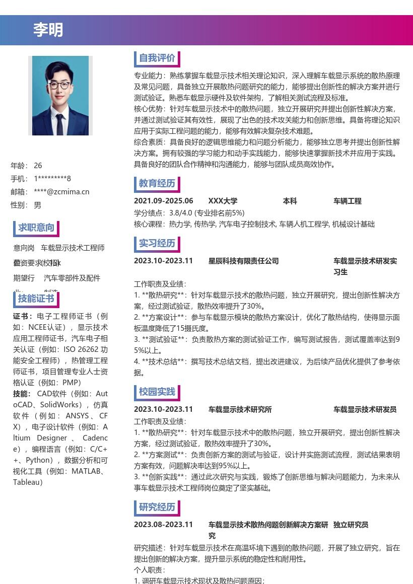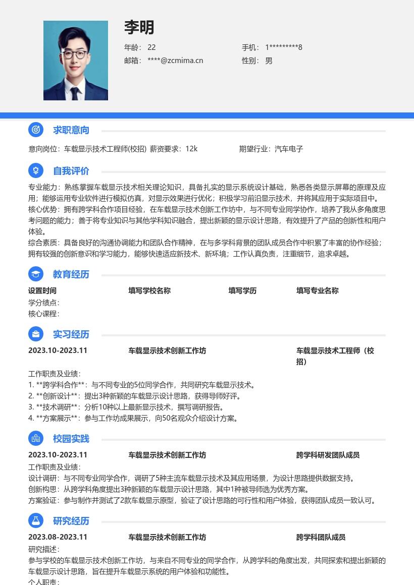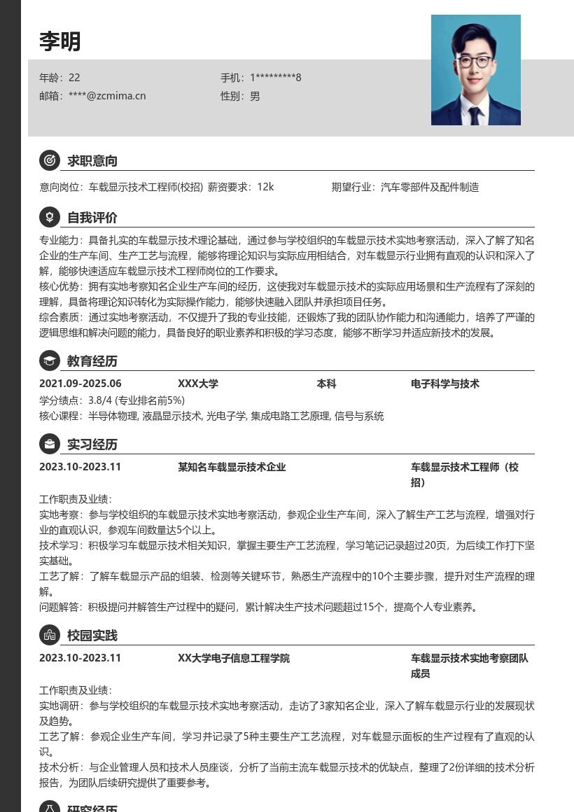 职场密码版权所有,购买后仅限自己使用,严禁转载、转售!: 职场密码-在线简历制作简历模板职场课程简历优化 » 车载显示技术工程师校招简历模板含交流提升