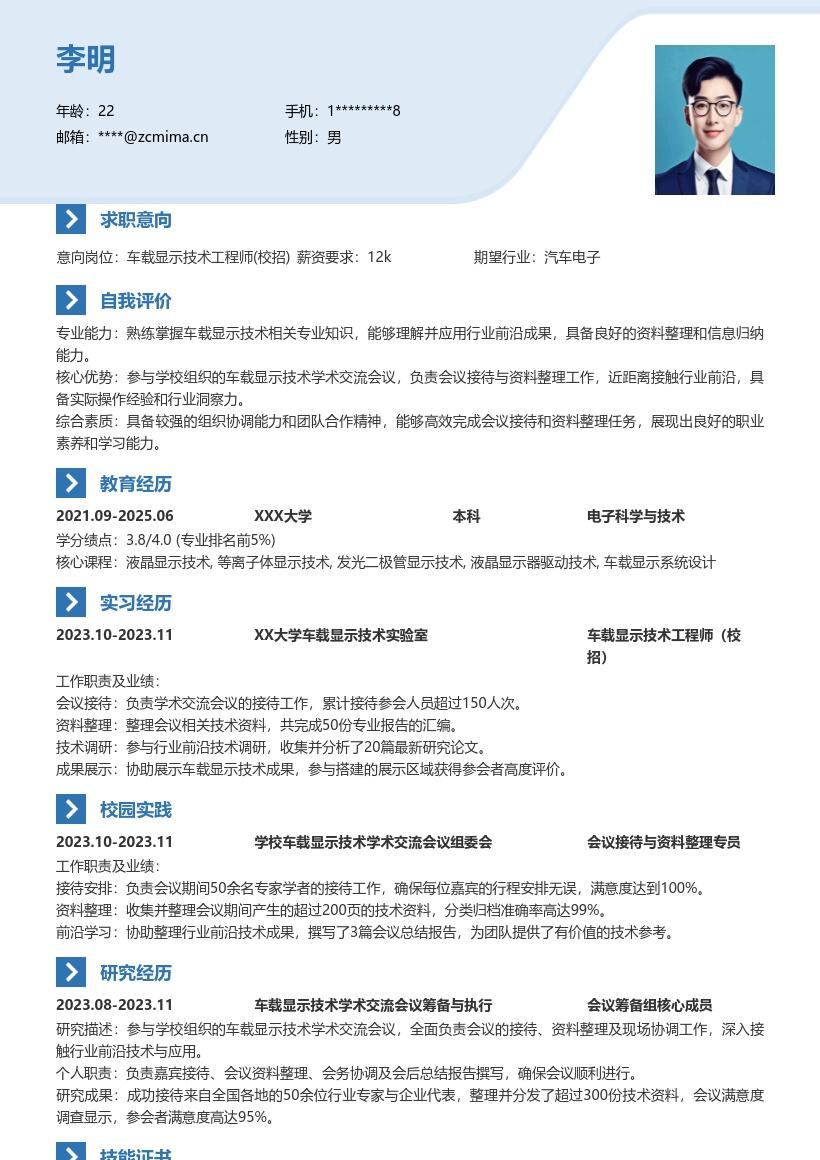 如果有参加过与车载显示技术相关的实践活动、竞赛经历或者发表过相关的学术论文等,也可在简历中适当补充。这些经历能够进一步丰富自己的简历内容,展示自己的综合能力和对车载显示技术领域的积极探索精神。实践活动可以是参加过的实验室项目、企业实习等;竞赛经历可以突出自己在竞赛中所取得的成绩和担任的角色;学术论文则要注明发表的期刊名称和论文主题。