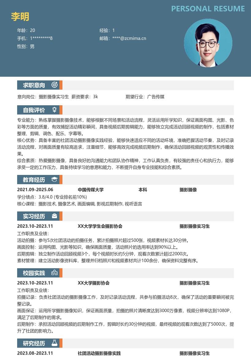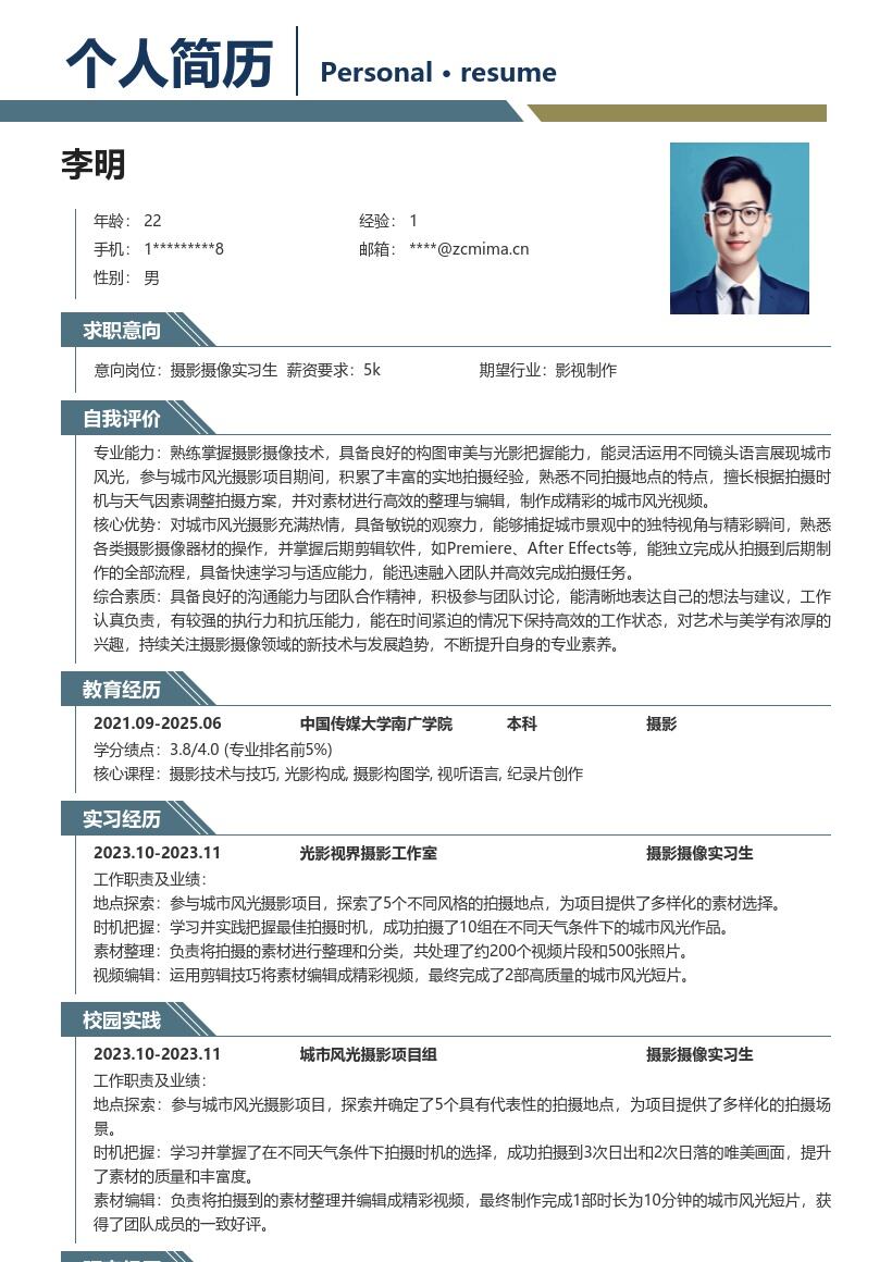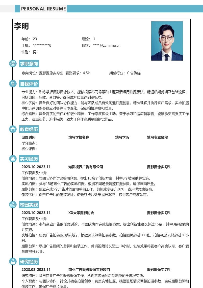 6. **自我评价部分**:简要概括自己的优势和特点,如对摄影摄像的热情,具备较强的观察力、创造力和团队协作精神。强调您在面对不同拍摄场景和任务时的适应能力,以及对细节的关注和对作品质量的追求。同时,表达您对摄影摄像行业的理解和对未来发展的期望,让招聘方感受到您的积极态度和职业规划。通过以上内容详细且有条理地撰写简历,能够全面展示您作为摄影摄像实习生的能力和潜力,增加获得实习机会的可能性。