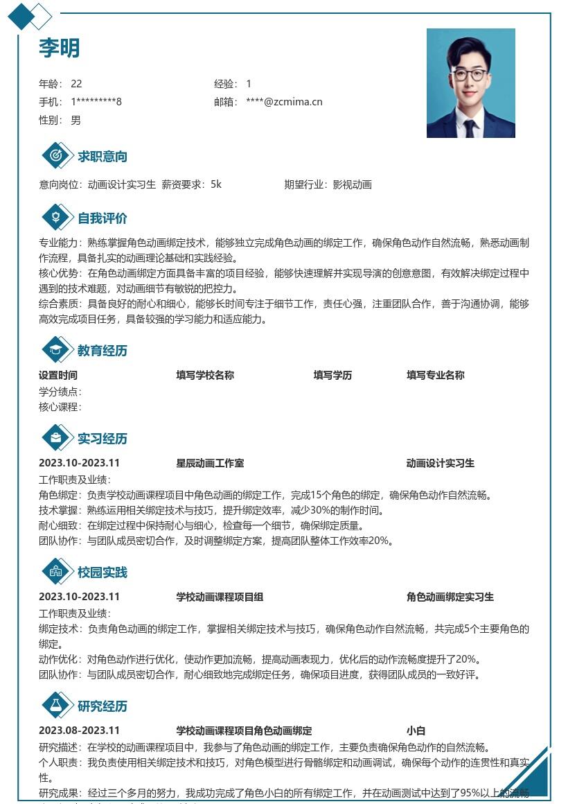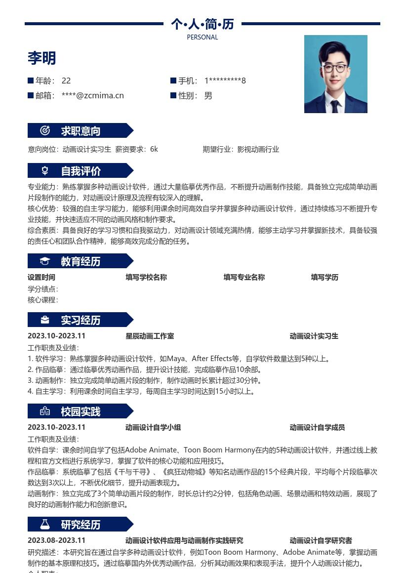 - 按时间顺序从最高学历开始填写。如果您是相关专业,如动画设计、数字媒体艺术等专业,要重点突出专业课程,比如动画原理、二维动画设计、三维建模基础等课程,这些课程与动画设计实习岗位紧密相关,能体现您的专业基础。