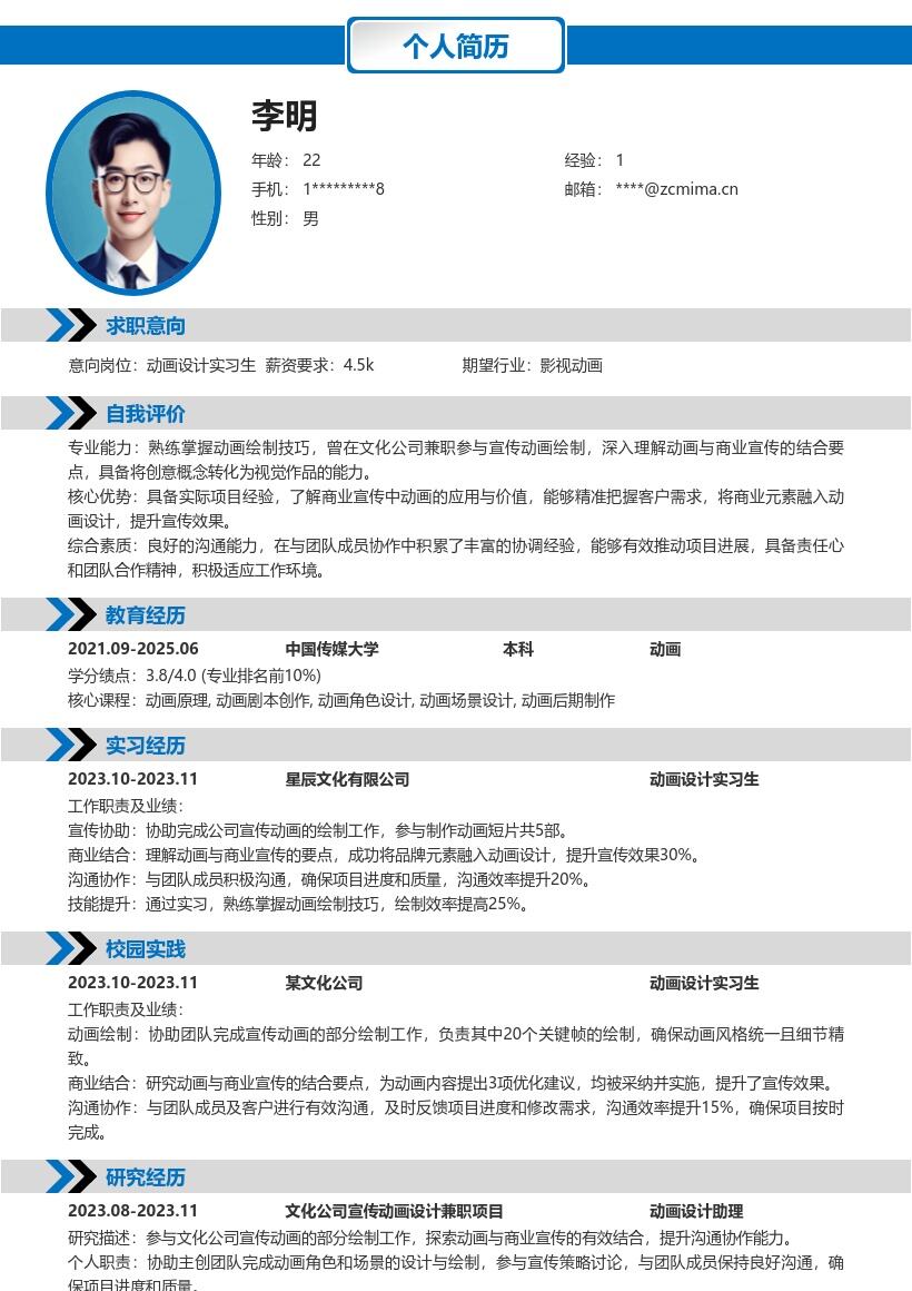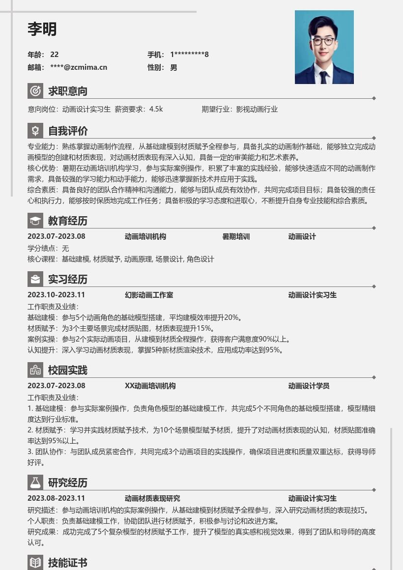 - 若有参加过相关的培训课程、讲座或获得过与动画设计相关的证书,也应在简历中适当展示,增加自己的竞争力。