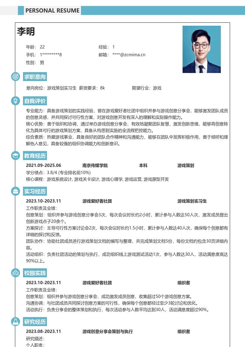 - 在自我评价部分,简要概括自己的优势和特点。强调对游戏策划的热情和浓厚兴趣,表明自己具有较强的创新思维和学习能力,能够快速适应新的知识和技能。