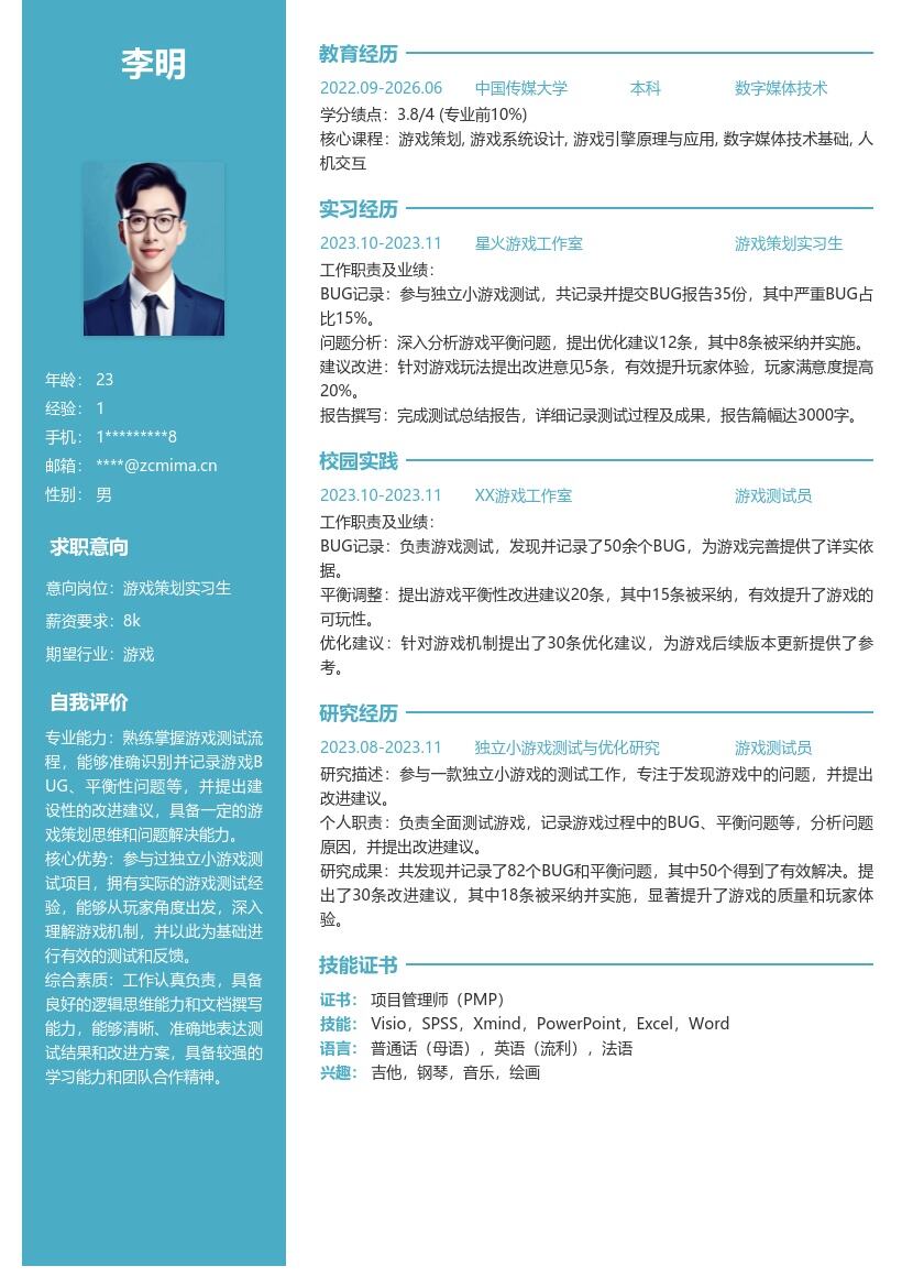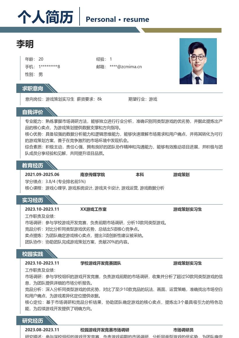 - 如果在学校期间获得过与游戏策划、创意设计相关的奖项,如校园创意游戏比赛奖项,要详细列出奖项名称、颁奖机构和获奖时间。这些奖项能直接证明你的能力和才华。