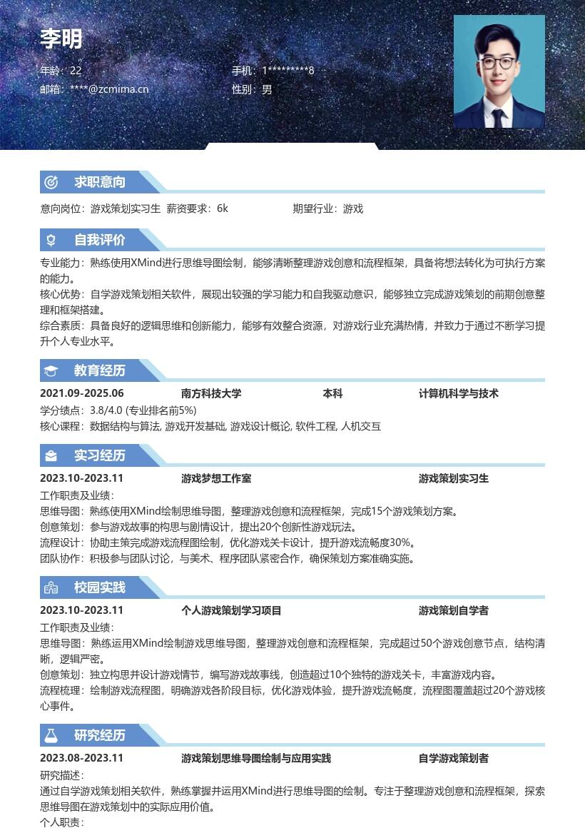- 如果在学校期间有过相关的学术成果,例如参与过与游戏设计有关的研究项目或发表过相关论文,要详细说明项目名称、担任的角色以及取得的成果,这能很好地展示自己的学术能力和对游戏策划领域的深入探索。