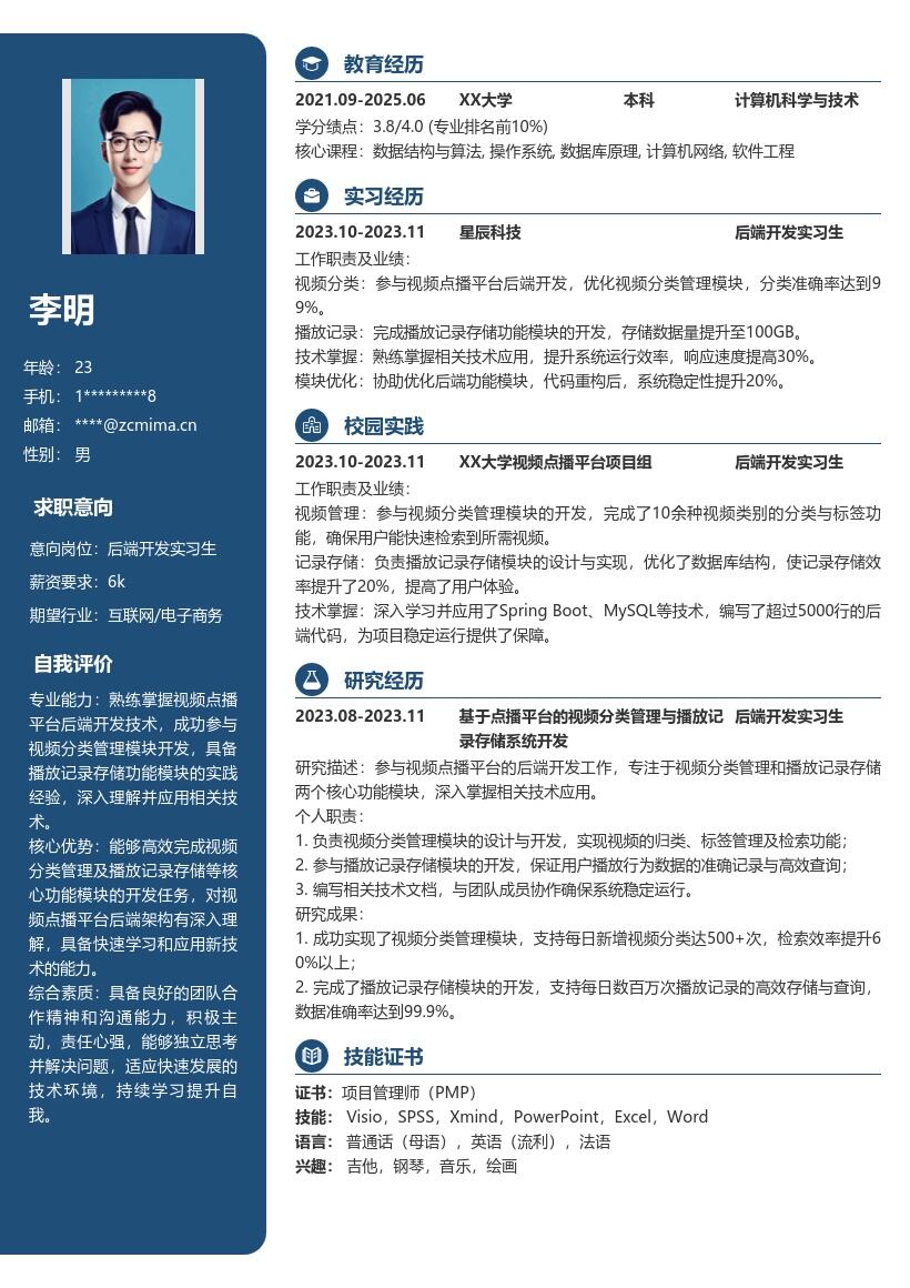 2. **教育背景描述**:按照从最高学历到最低学历的顺序填写。对于在校学生,要写明学校名称、专业名称、入学时间与预计毕业时间。如果你的专业课程与后端开发相关度高,可适当列举一些核心课程,如数据结构、计算机网络、编程语言(如Java、Python等)。通过展示专业课程,让招聘者了解你具备的专业知识基础。