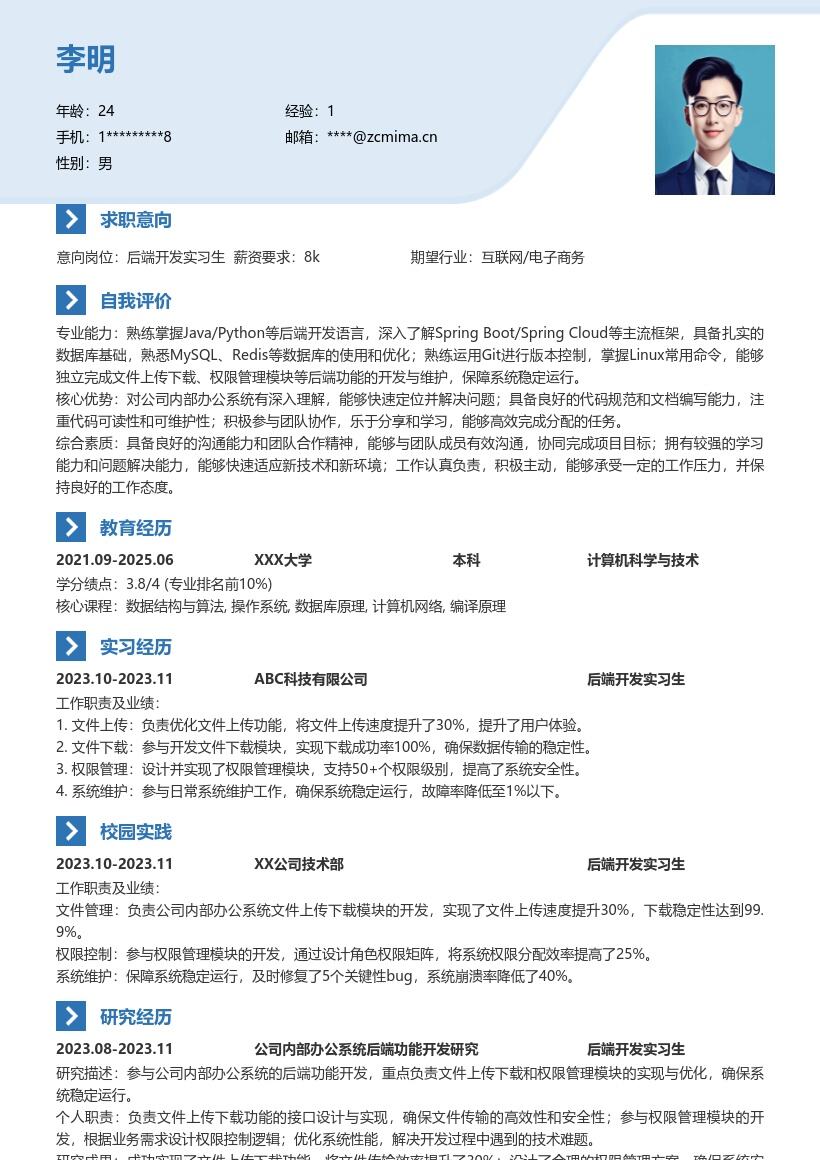 1. **个人信息部分**:首先,在简历开头清晰填写个人基本信息,包括姓名、性别、联系方式(手机号码与电子邮箱)、求职意向明确写后端开发实习生岗位。联系方式务必确保准确无误,方便招聘方能够顺利联系到你。这部分内容要简洁明了,突出关键信息,让招聘者一眼就能获取他们需要的基本资料。