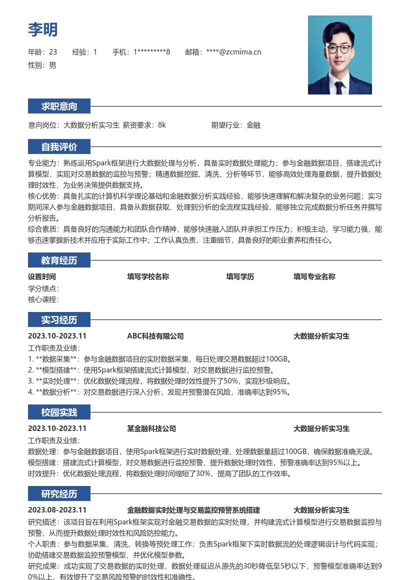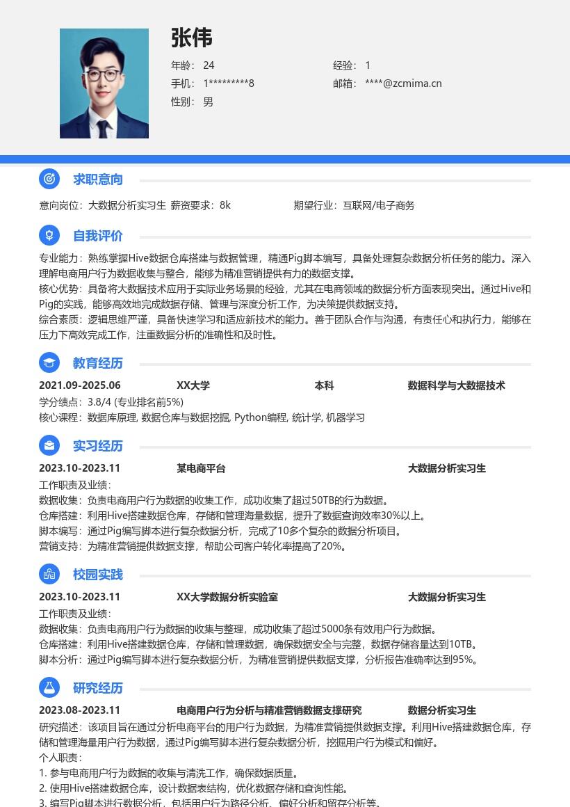 职场密码版权所有,购买后仅限自己使用,严禁转载、转售!: 职场密码-在线简历制作简历模板职场课程简历优化 » 20多套大数据分析实习生岗位简历模板合集word版