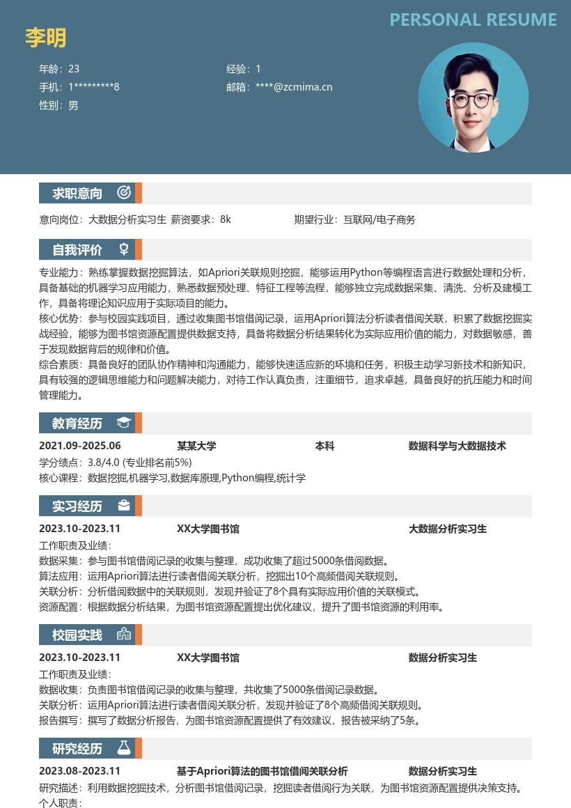 3. **教育背景**:按照最高学历在前的顺序填写。如果是本科,需写明学校名称、专业名称、入学时间和毕业时间。对于大数据分析相关专业,可列举一些所学的核心课程,如数据结构、统计学、编程语言(Python、Java等),展示自己有一定的专业知识基础。如果有相关的课程项目或者实验经历,也可以简要提及。