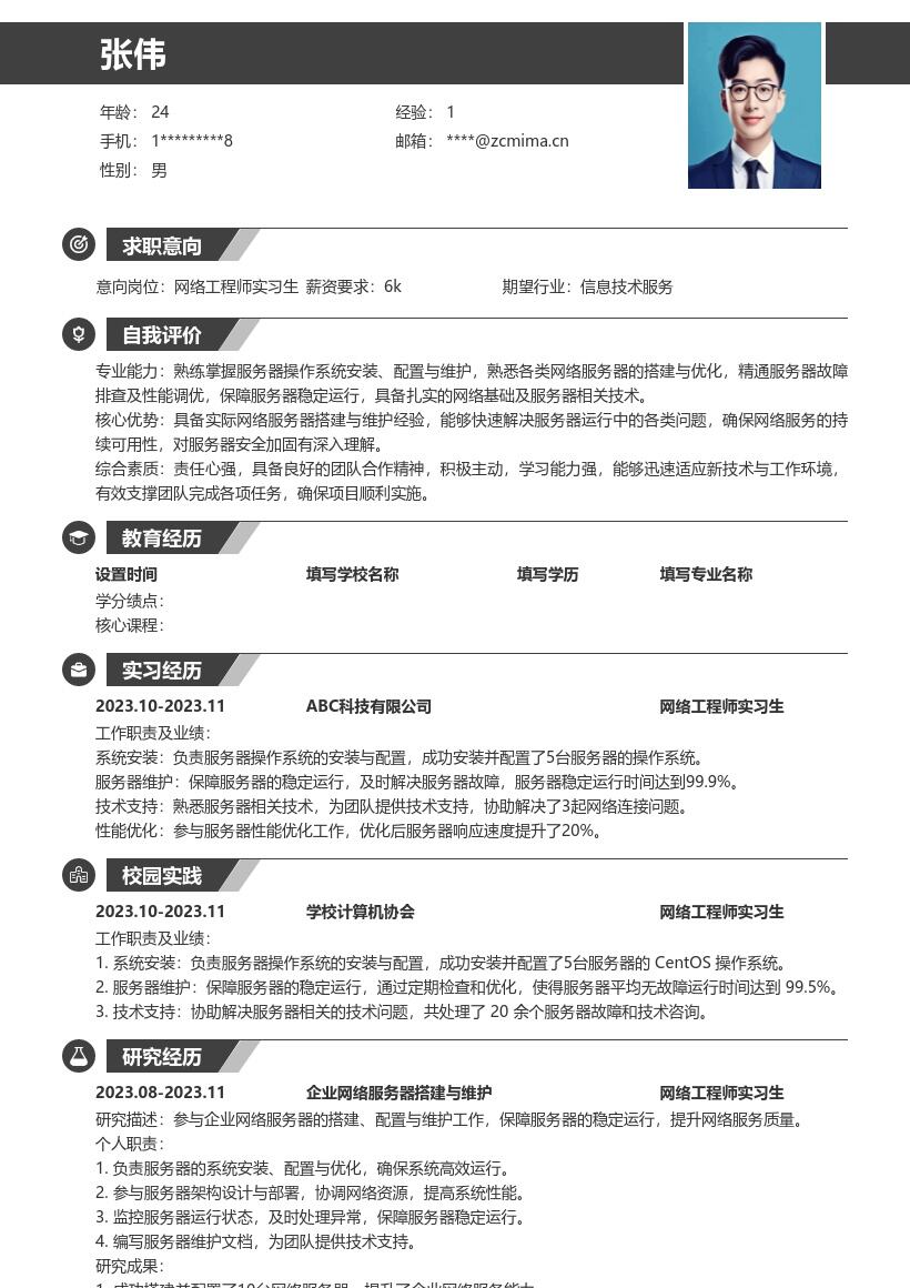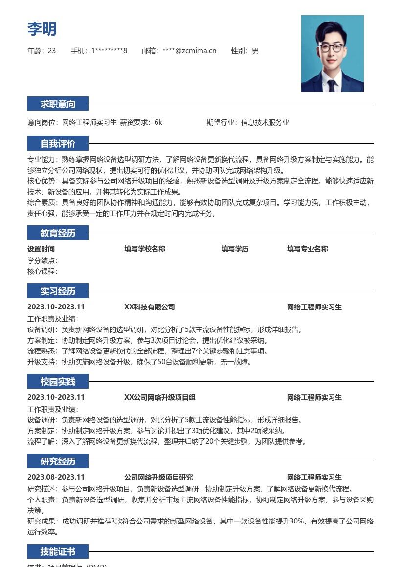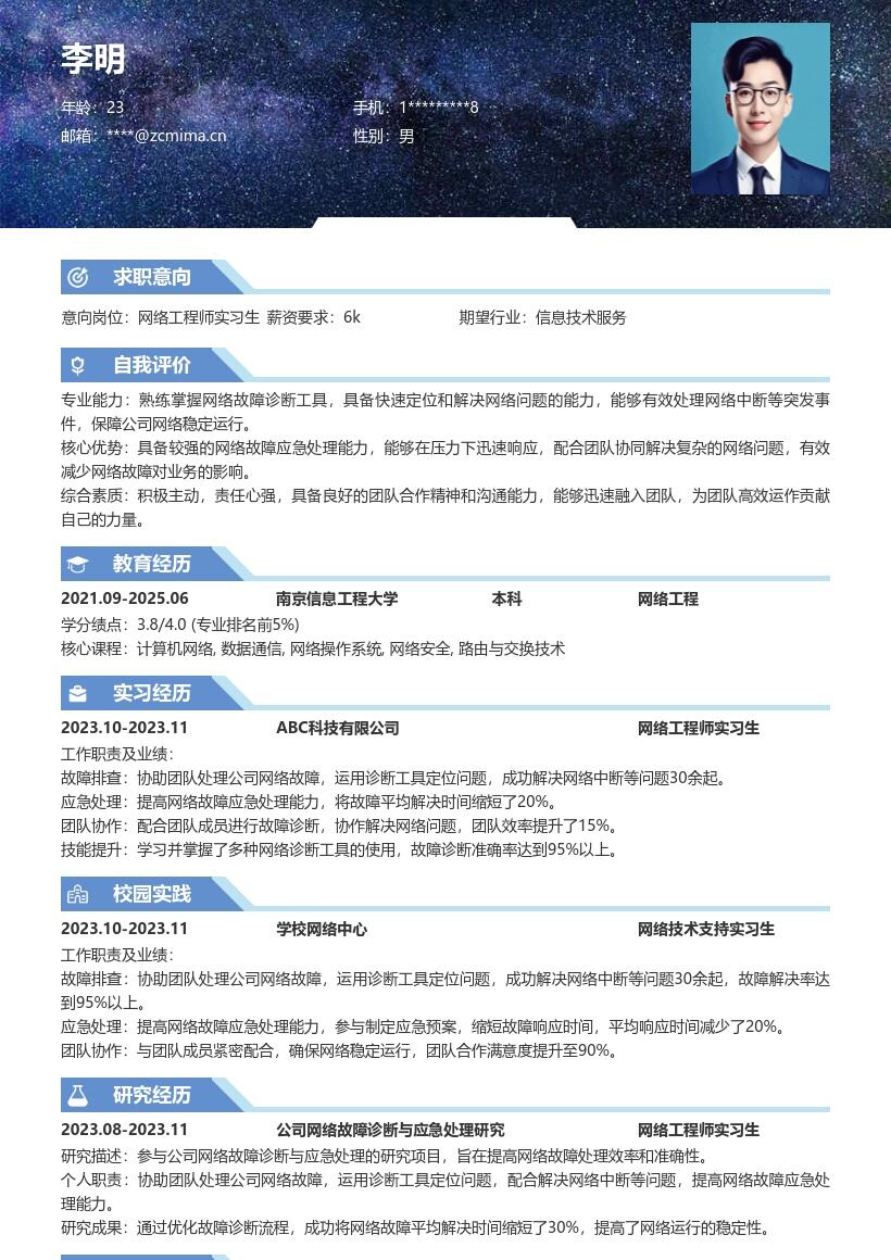 3. **教育背景**:按从高到低的顺序列出你的学历,包括学校名称、专业、入学时间和毕业时间。如果在校期间有相关课程成绩较为突出,比如计算机网络、网络工程原理等,可以单独列出成绩,展示你的专业知识储备。若是有获得过相关奖学金或荣誉,也在此部分清晰呈现,增加竞争力。