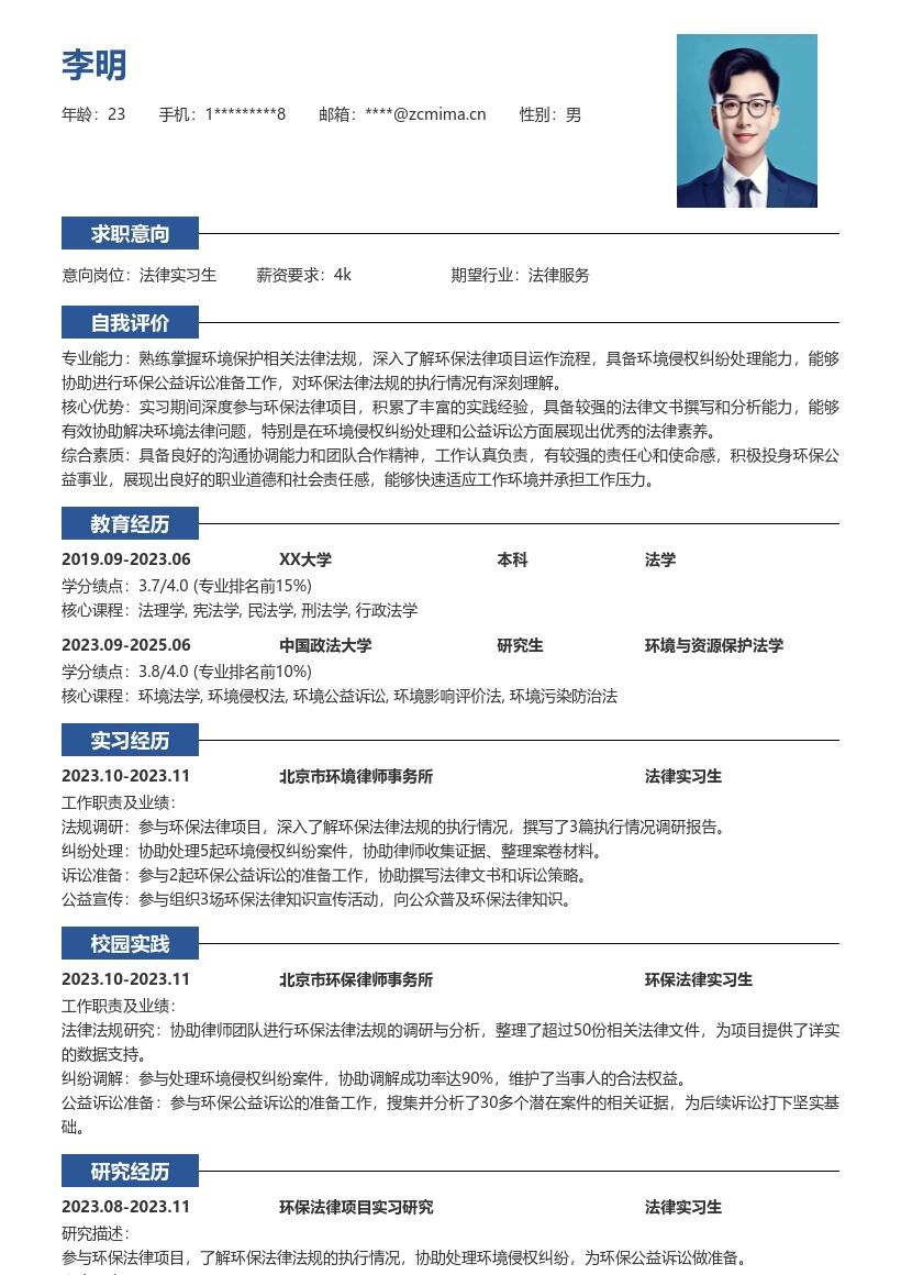 - 所在学校及专业要详细填写,对于法律实习生岗位,法律相关专业是重点突出内容。入学时间和预计毕业时间也需明确标注,让招聘者能快速了解你的教育进度。