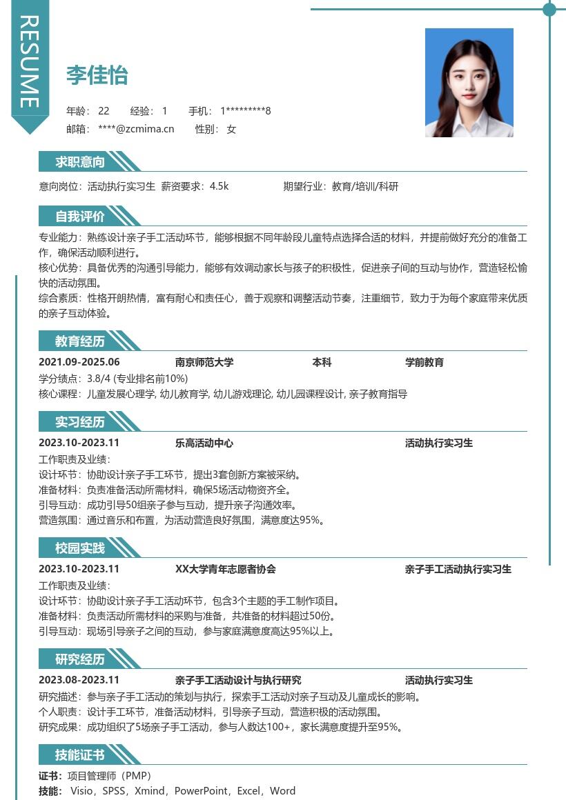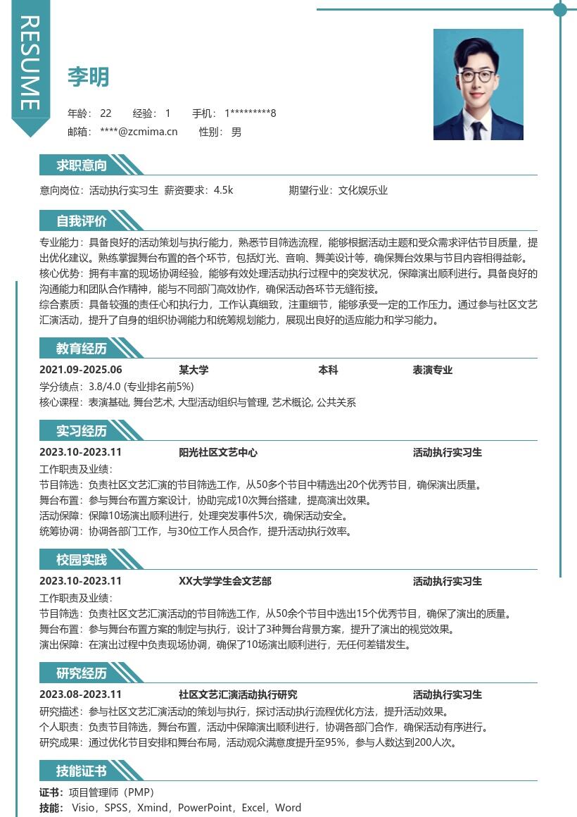 - 首先,在简历开头要清晰准确地填写个人信息。姓名需用真实全名,确保简洁明了。联系方式方面,手机号码要保持畅通,电子邮箱建议使用常用且正式的邮箱,比如以自己名字命名的邮箱,方便招聘方及时与你取得联系。此外,要注明求职意向为活动执行实习生,明确自己的求职方向,让招聘方一眼就能了解你的目标岗位。