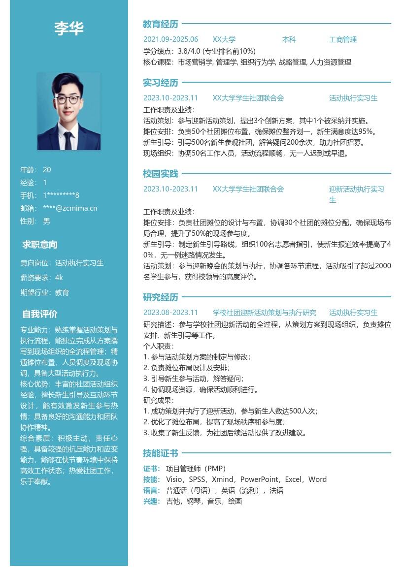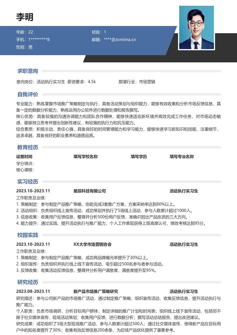 - 按时间倒序填写最高学历及相关信息。如果是本科在读,要写上学校名称、专业名称、入学时间和预计毕业时间。对于与活动执行相关的课程,如管理学、市场营销学等,可以适当列举,突出自己在理论知识方面的储备。如果有在校期间获得的与活动执行相关的奖学金、荣誉称号等,也应在此部分清晰展示,体现自己的学习能力和优秀表现。