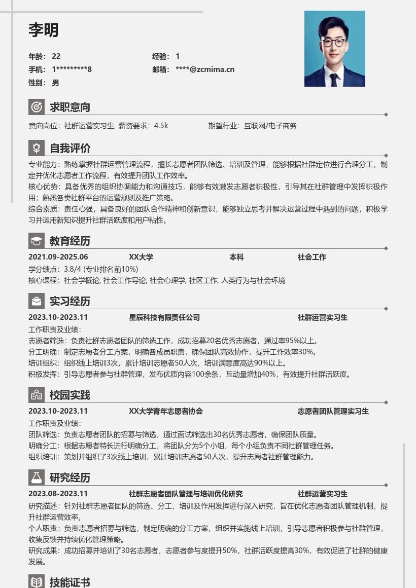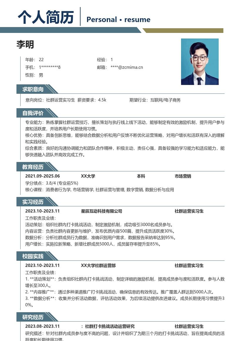- 如果没有正式工作经历,学校社团活动、志愿者活动等相关经验也可以写进来,强调在这些活动中锻炼到的沟通能力、组织能力等与社群运营相关的能力。