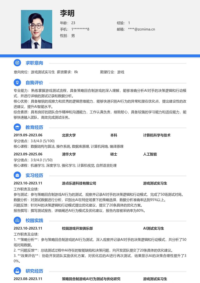 2. **求职意向**:明确写出应聘的职位为游戏测试实习生,让招聘者一眼明了你的求职方向。同时,可适当提及对游戏行业的热情,例如表明自己一直热衷于游戏领域,渴望在游戏测试岗位上贡献力量,体现出你对该岗位的向往和积极态度。
