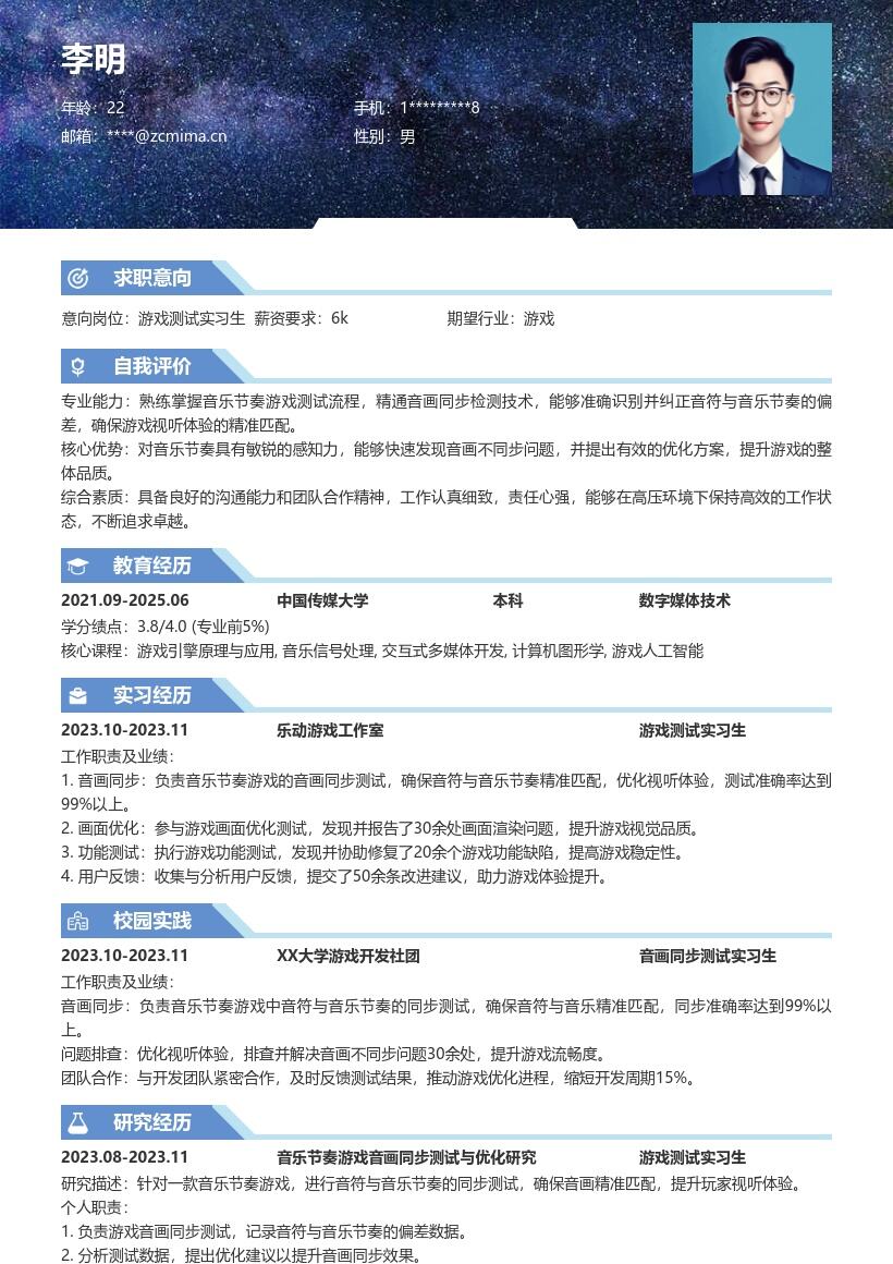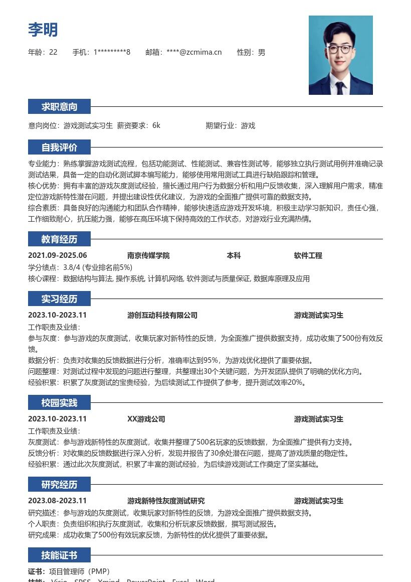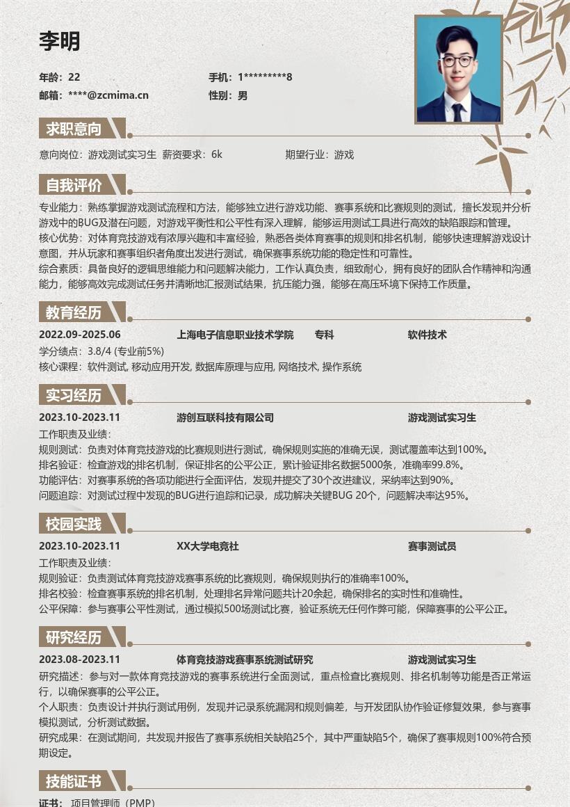 3. **教育背景**:详细罗列自己的教育经历,从最高学历开始写起。列出学校名称、专业名称、入学时间和毕业时间。如果在学校有相关课程成绩较为突出,如软件工程、测试技术等与游戏测试相关课程,可以选择性列出成绩,以展示自己在专业知识上的积累。另外,若参与过学校组织的与游戏相关的项目或实践活动,一定要详细描述,包括活动内容、自己承担的角色和取得的成果。