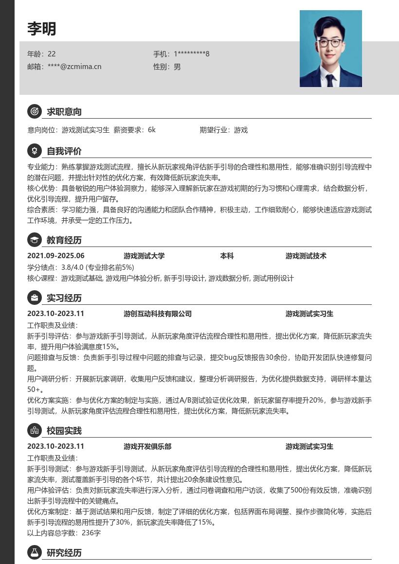 职场密码版权所有,购买后仅限自己使用,严禁转载、转售!: 职场密码-在线简历制作简历模板职场课程简历优化 » 游戏测试实习生验证更新内容简历模板