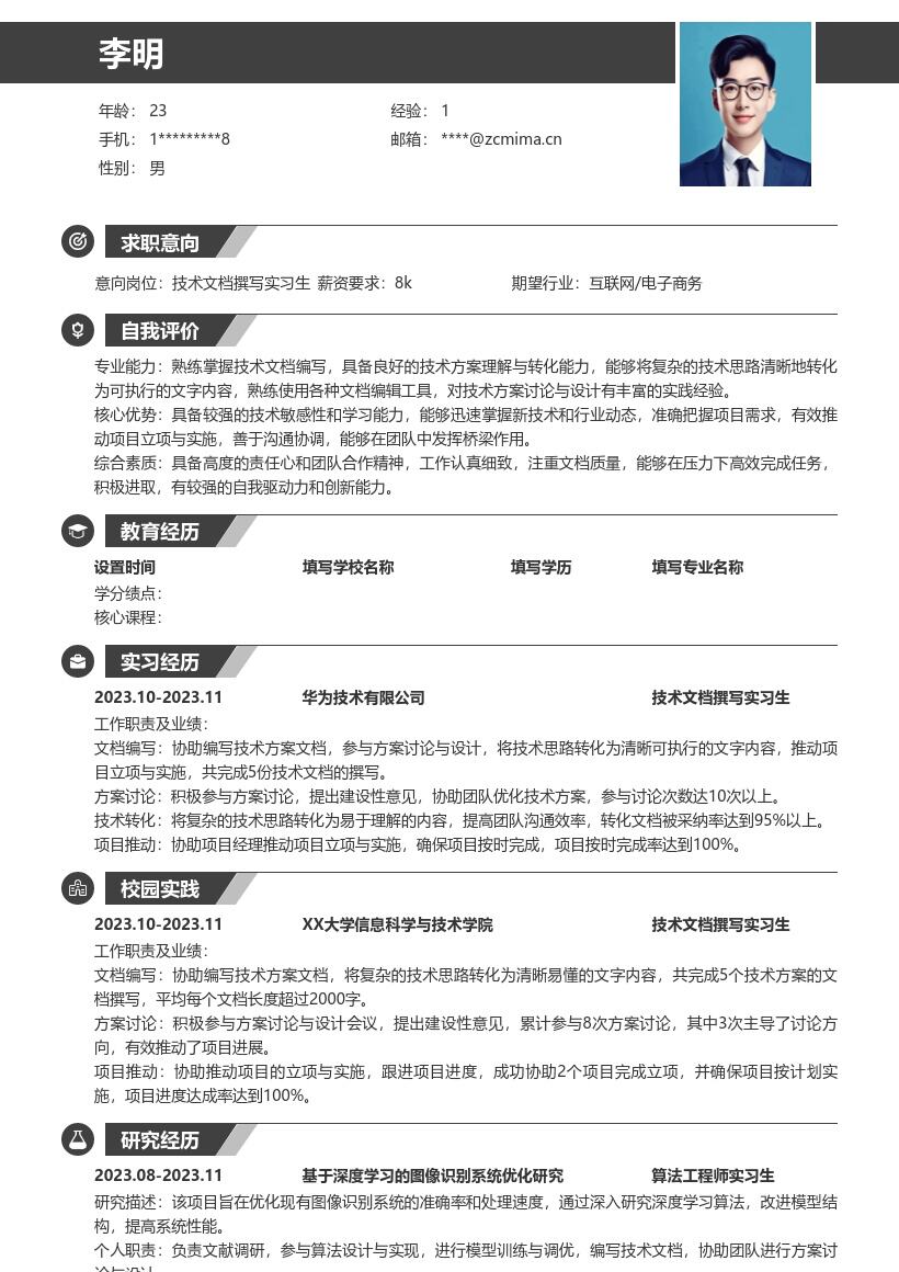 3. **教育背景**:按照从最高学历到最低学历的顺序填写。列出学校名称、专业名称、入学时间和毕业时间。如果在校期间有相关课程学习,如技术写作、软件工程等,可以详细罗列出来,展示自己在专业知识方面的储备。对于成绩优异或获得过奖学金、荣誉称号的情况,也要在这部分适当体现,增加自己的竞争力。