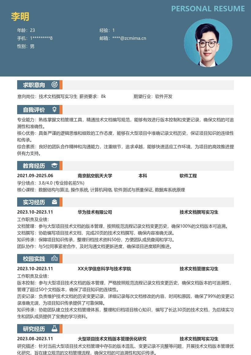 4. **技能清单**:着重突出与技术文档撰写相关的技能。比如熟练掌握的文档编辑工具,如Microsoft Word、WPS文字等;是否了解一些版本控制工具,如Git;有没有掌握绘图工具用于制作技术文档中的图表,像Visio等。此外,具备良好的英语读写能力对于阅读和编写国际化技术文档很有帮助,也可在技能部分说明自己的英语水平等级。
